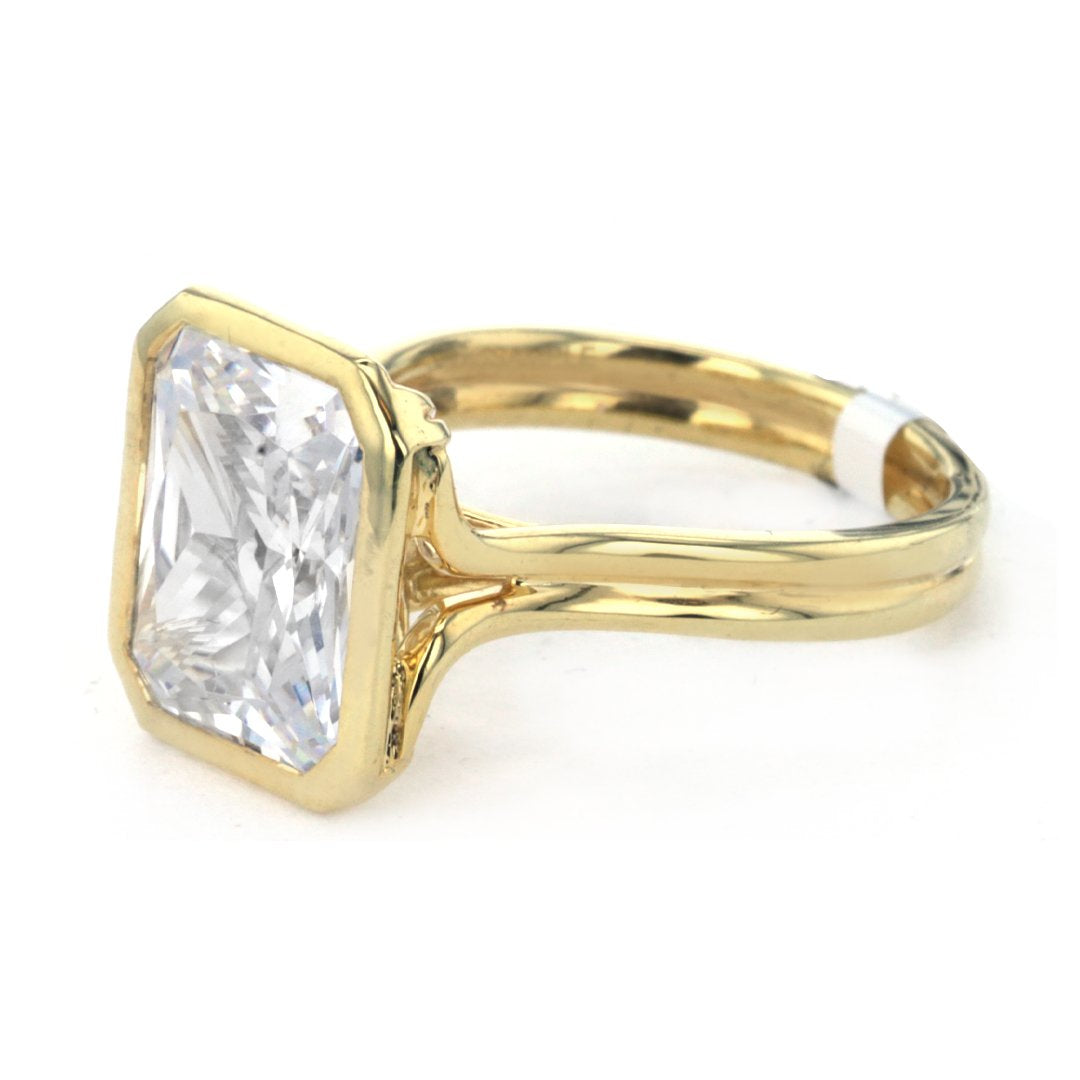This 14K yellow gold bezel ring, made for a 5.00ct radiant center, features one bezel-set round diamond totaling 0.02ct. In-store ring is a sample. Available by special order only. Other metal colors, types, diamond shapes, and sizes are also available by special order. Center sold separately.