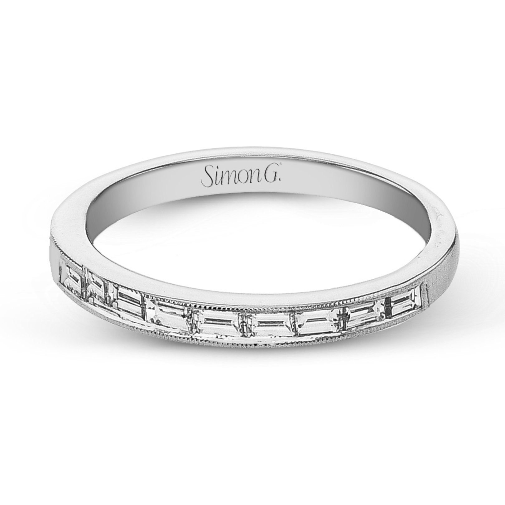 18K white gold milgrain anniversary band with 12 channel-set baguette diamonds totaling 0.52ctw, F–G/VVS quality.