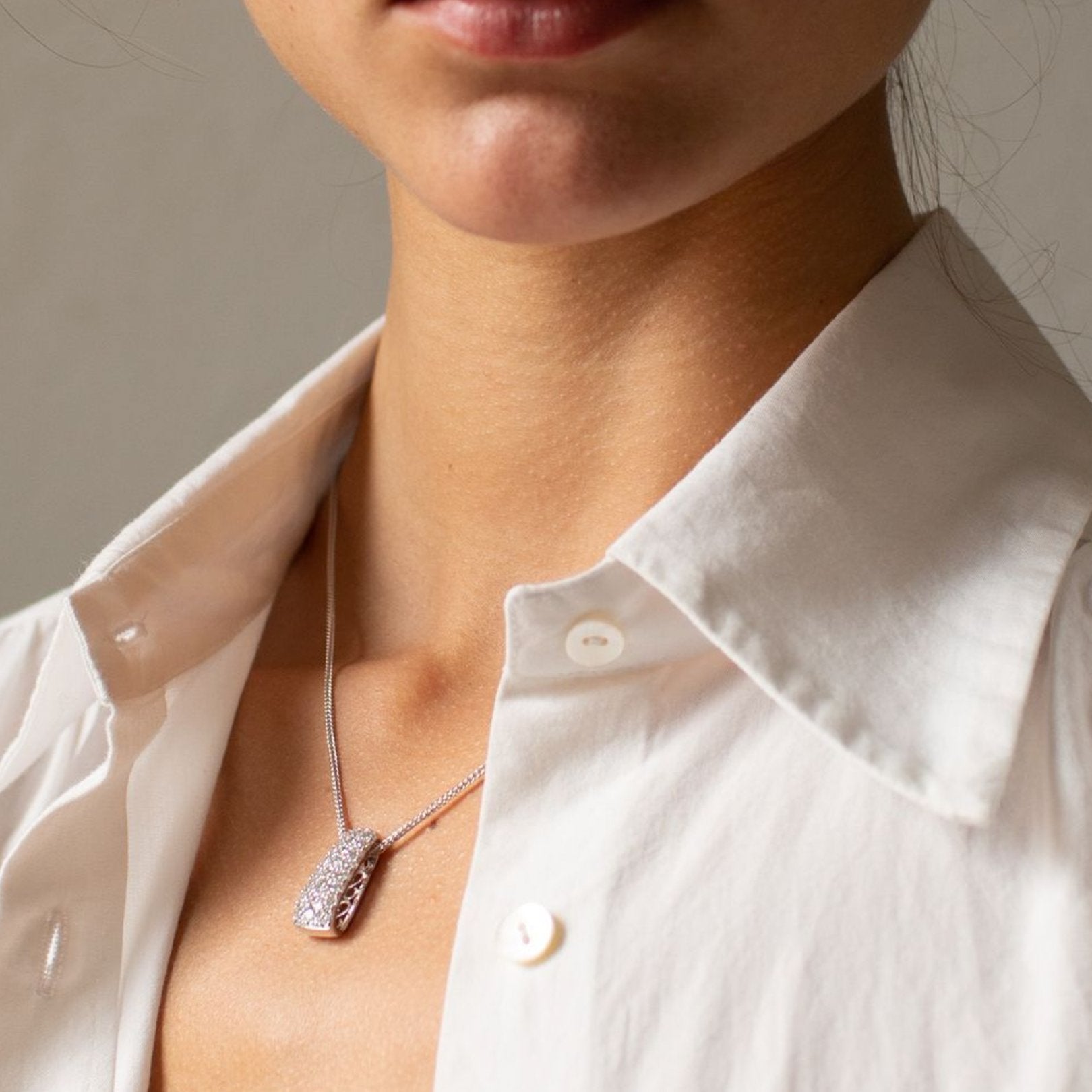 18kt white gold dome pendant with graduating diamonds totaling 1.51ctw (GH/VS2), on a 17"+2" 18kt white gold chain.