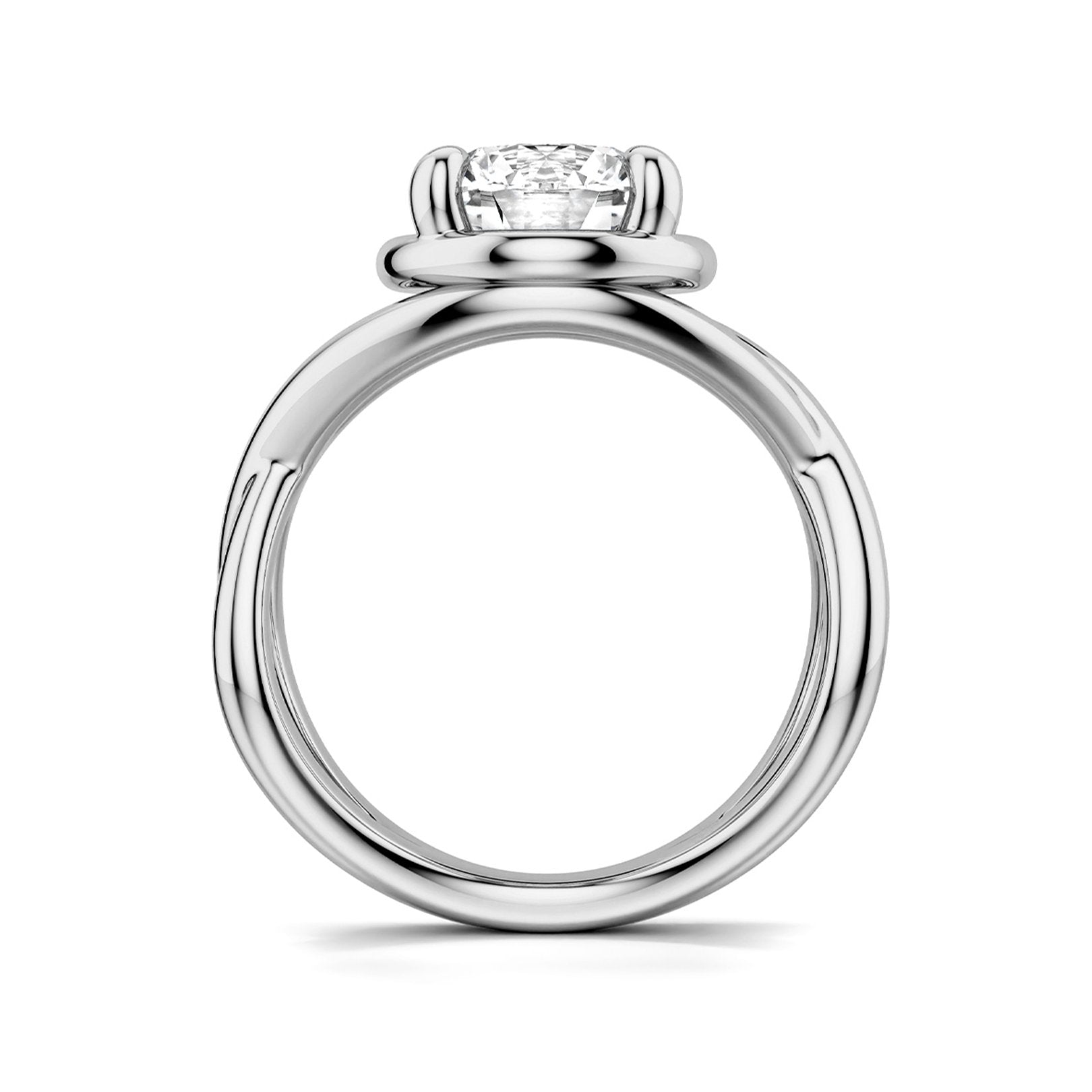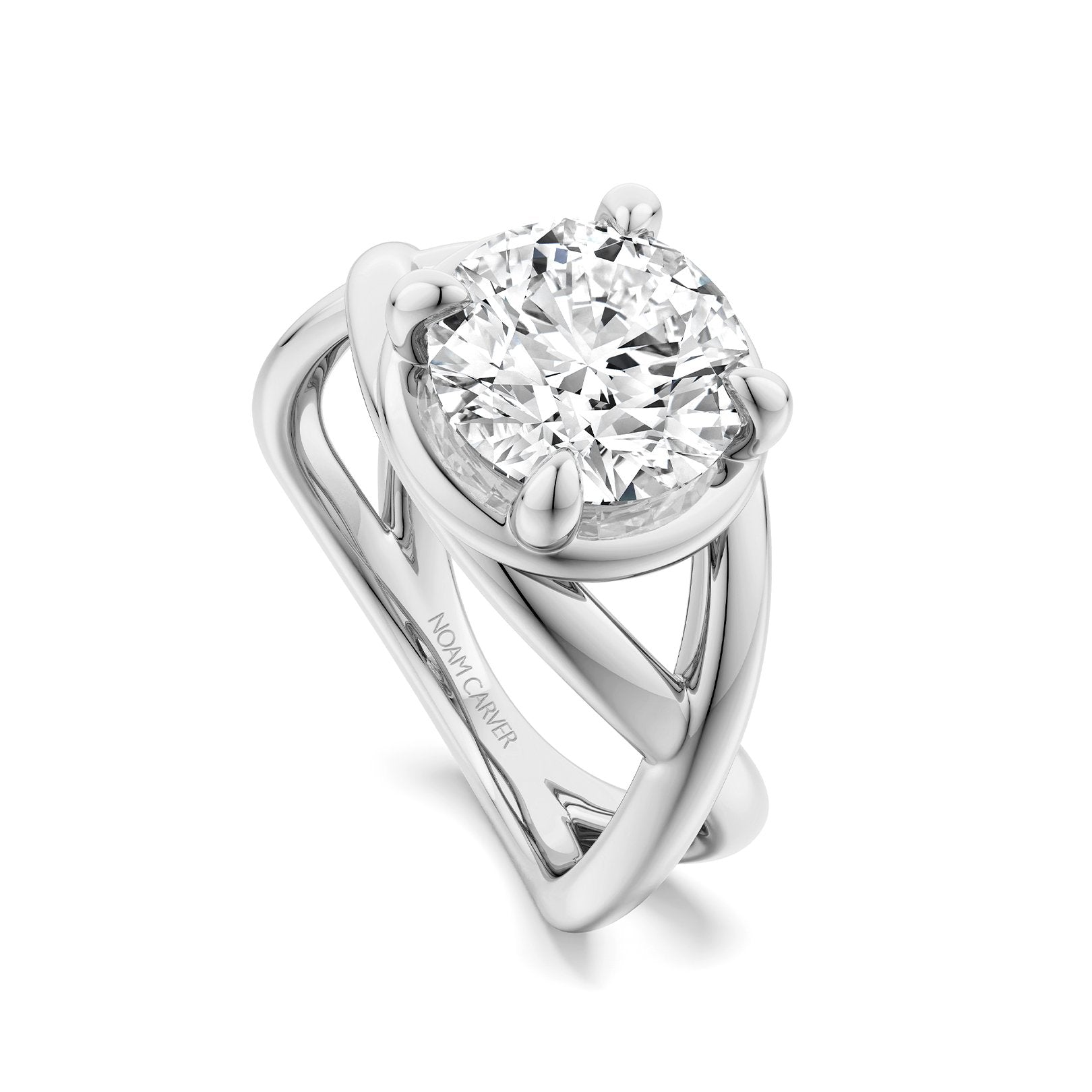 This 14K white gold Noam Carver infinity solitaire ring features a four-prong crown sized for a 2.50ct round center and a 2.2mm wide band. Center sold separately. Available by special order in other metals, shapes, and sizes.