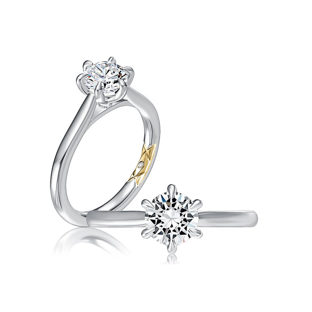 18KT white gold cathedral solitaire ring with a 6-prong setting designed for a 2.00CT round center. Features a subtle rose quilt accent, hidden diamond detail, and one flush-set round diamond (0.01CT) in the shank for added charm. Center sold separately. Available by special order in other metals, shapes, and sizes.