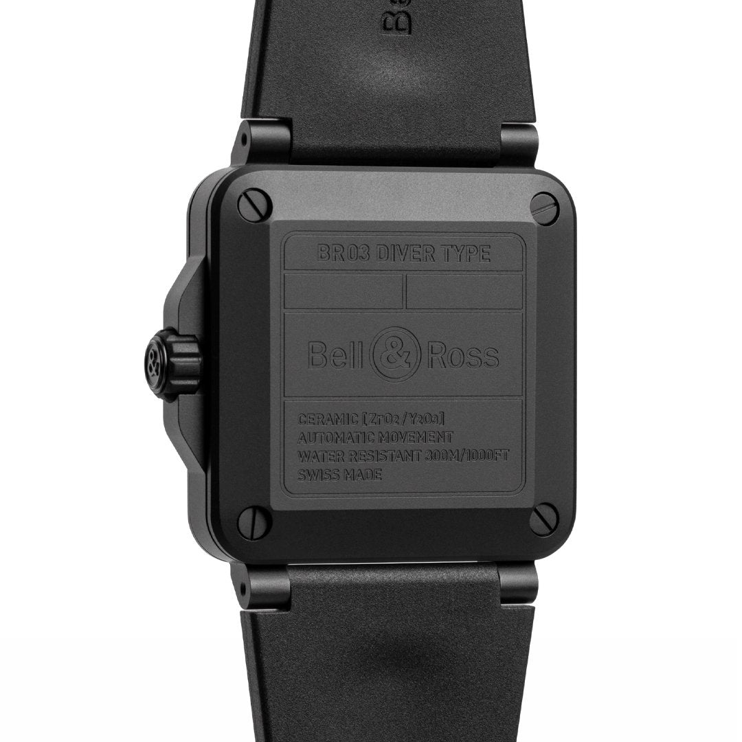 Automatic dive watch with Calibre BR-CAL.302-1, 54-hour power reserve, and date display. Features a 42mm microblasted black ceramic case with unidirectional rotating bezel, black dial with Super-LumiNova® X2 hands, indices, and markers, and sapphire crystal. Water-resistant to 300 meters. Fitted with a black rubber and synthetic fabric strap with black PVD microblasted steel pin buckle.