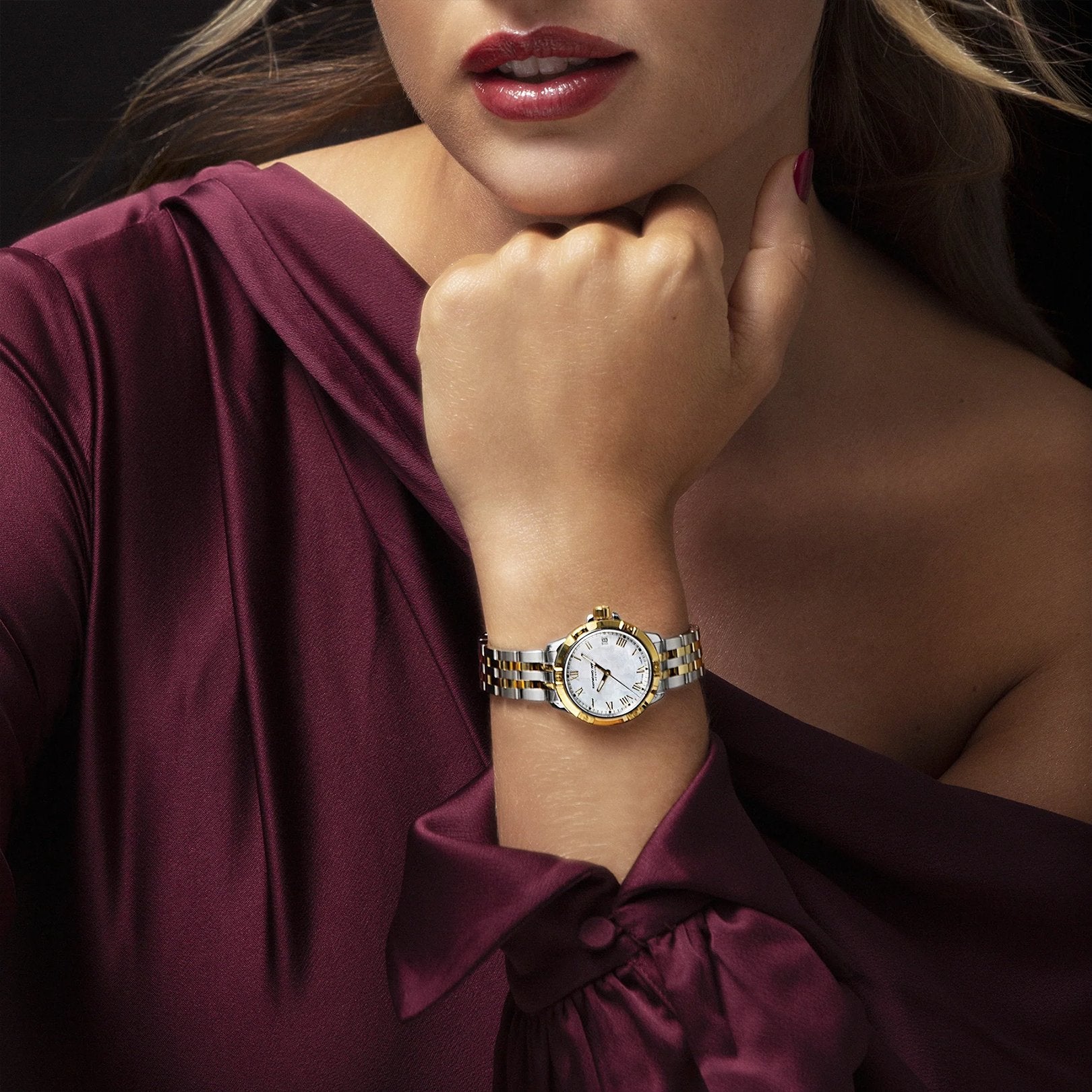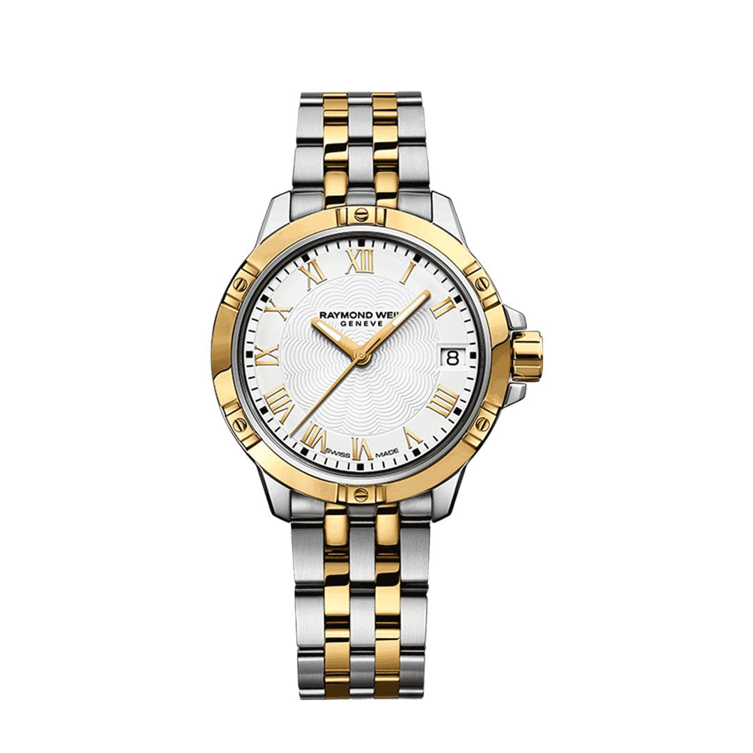 Tango 30mm watch with a stainless steel and PVD yellow gold-plated case, white dial with gold Roman numerals, and a two-tone satin/polished 5-link stainless steel and yellow gold-plated bracelet.
