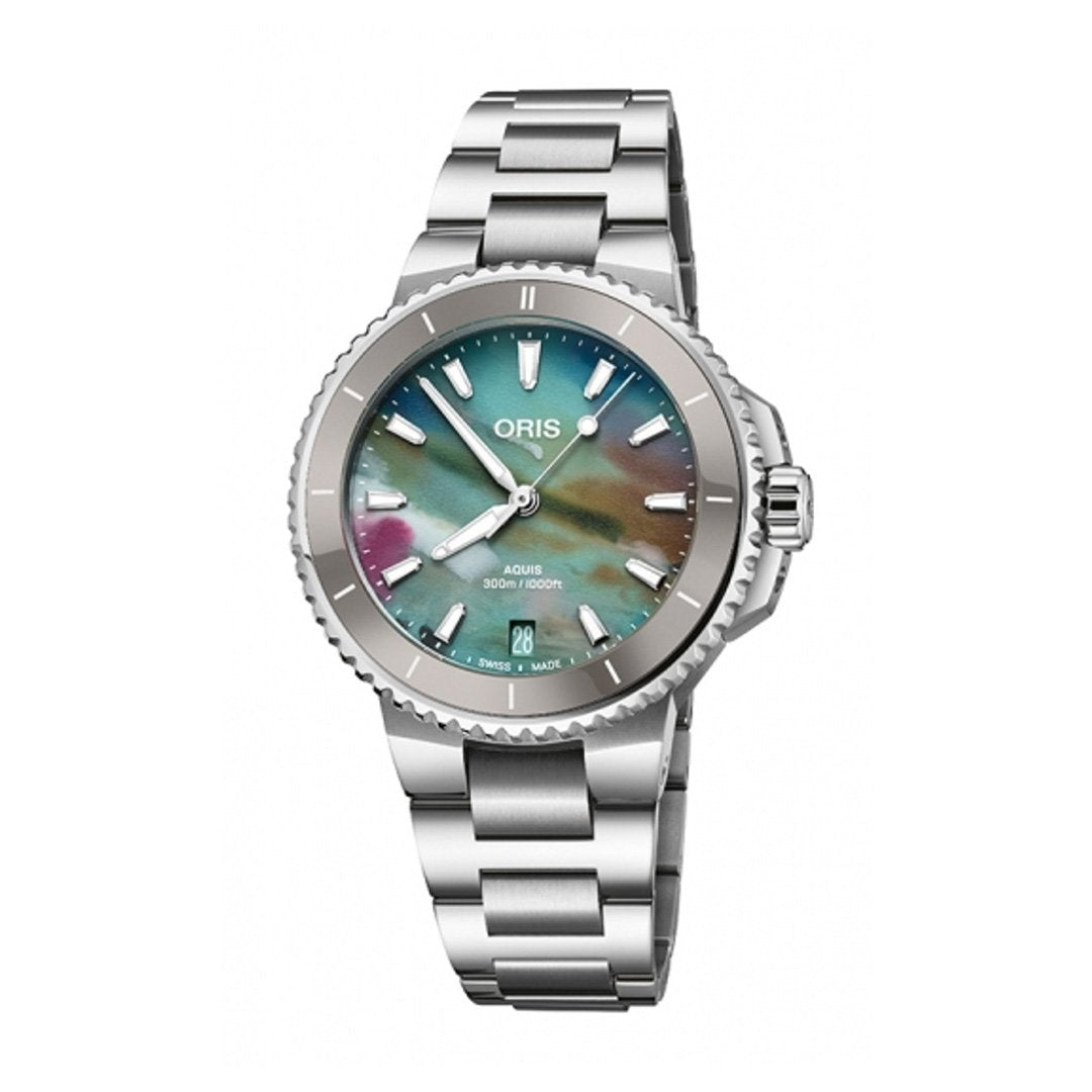 The Oris Aquis Date Upcycle features a 36.5MM stainless steel case and a unique multicolored recycled dial, making each piece one-of-a-kind. Accented with a gray ceramic bezel ring and finished on a satin and polished stainless steel bracelet.