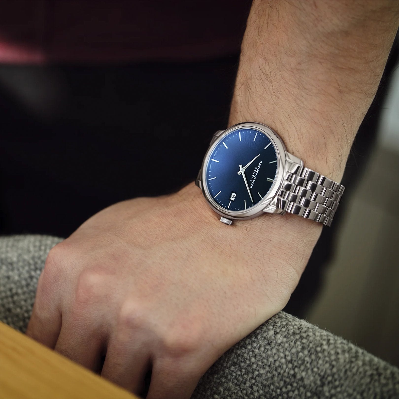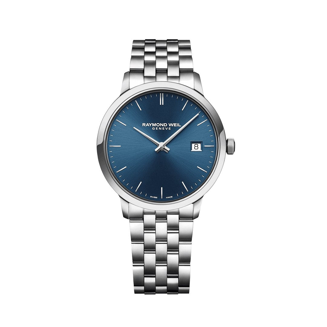 Toccata Quartz with a 39mm case, blue dial, date display, and a stainless steel bracelet with deployant clasp.