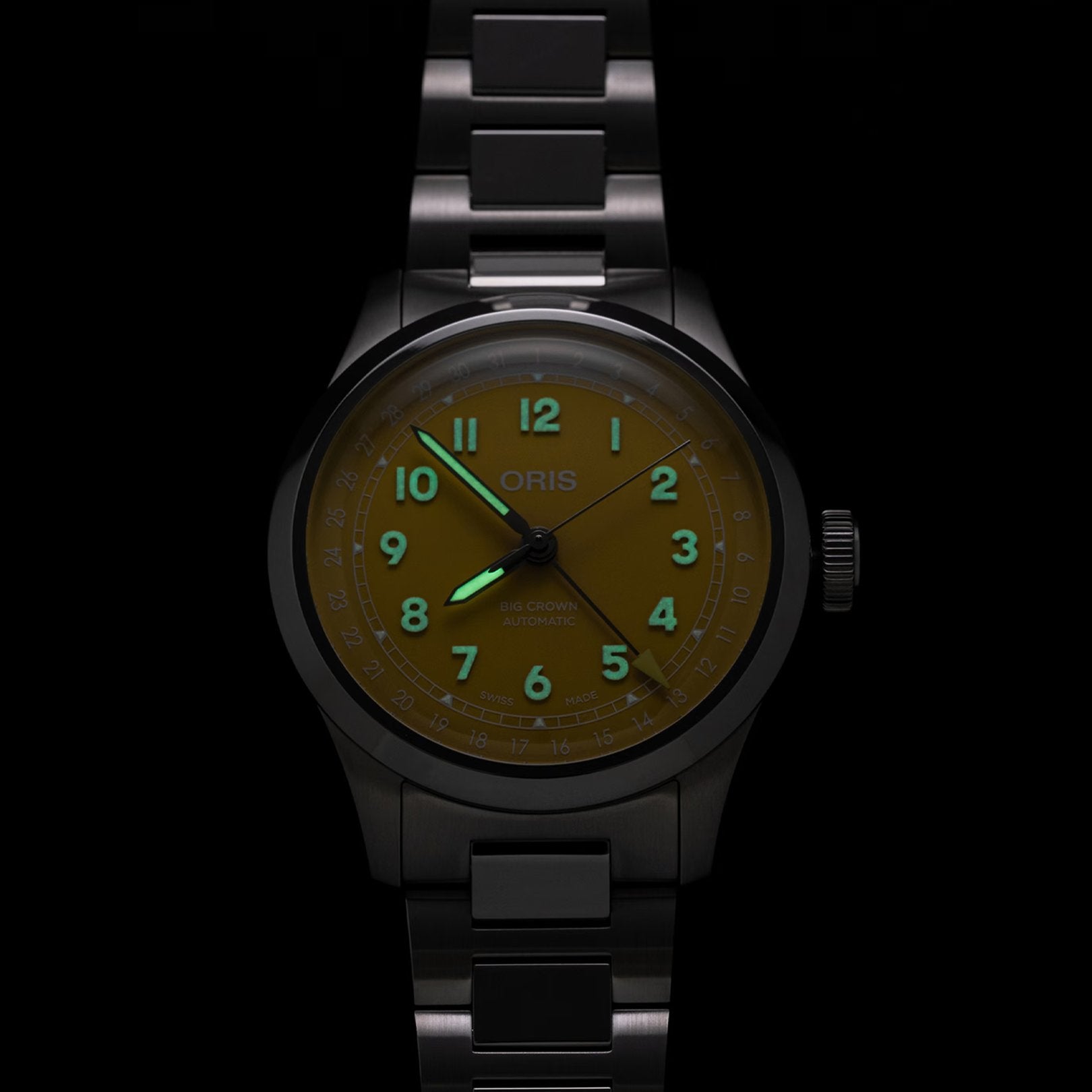 Big Crown Pointer Date 40mm with a stainless steel case, sunshine yellow dial, and H-link stainless steel bracelet with 2-button deployant clasp.