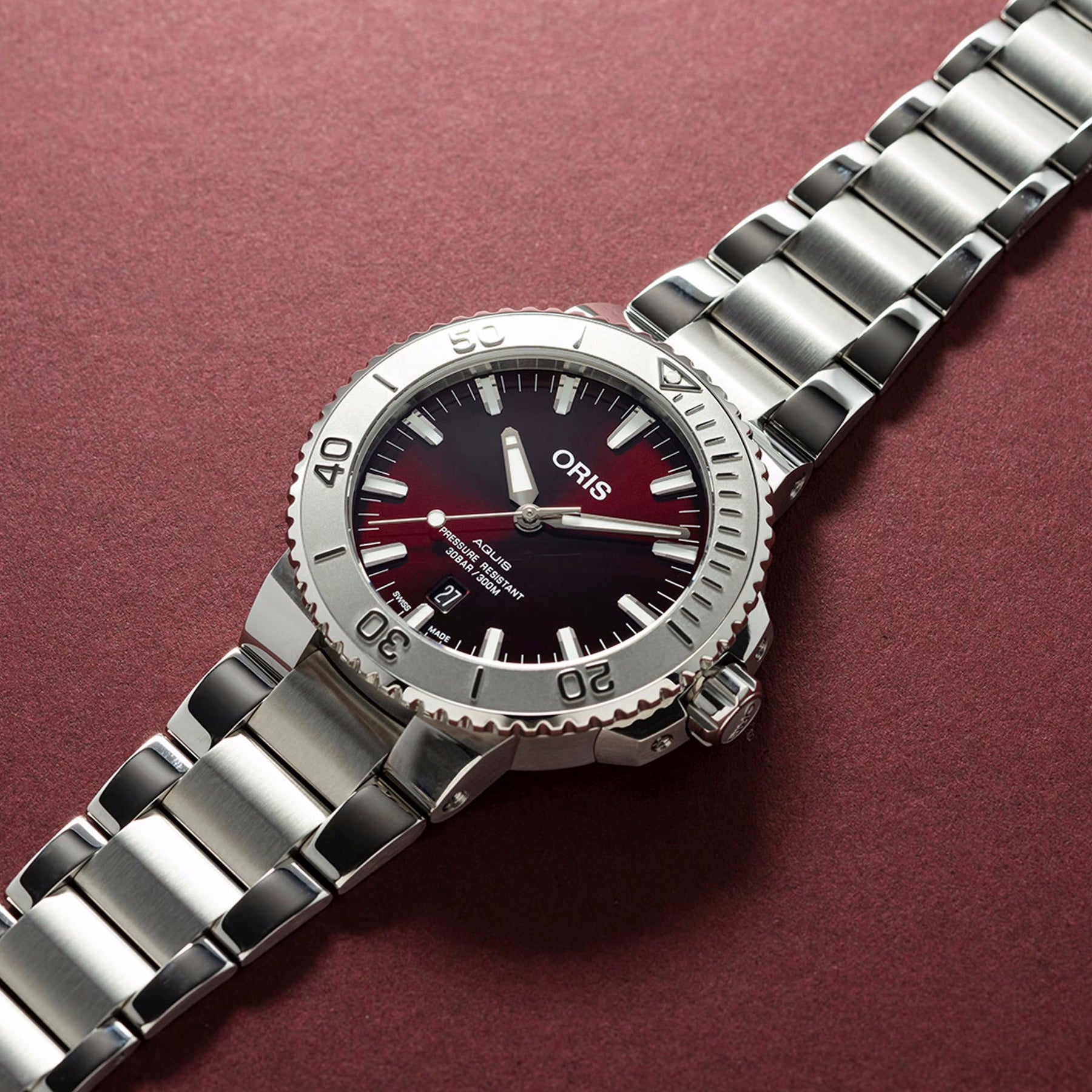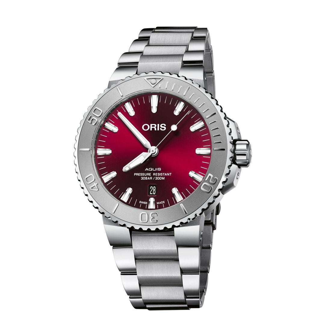 The Oris Aquis Date Relief Cherry Edition showcases a striking 41.5MM stainless steel case with a vibrant red dial. Finished with a polished and satin stainless steel bracelet.