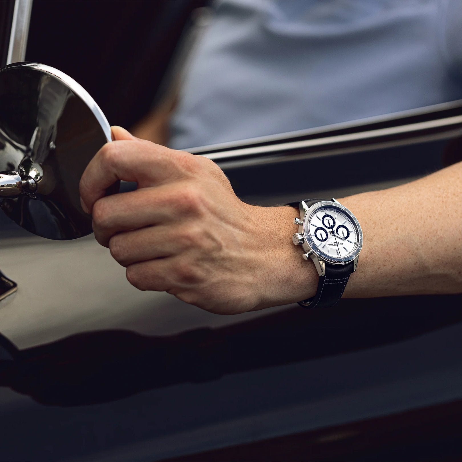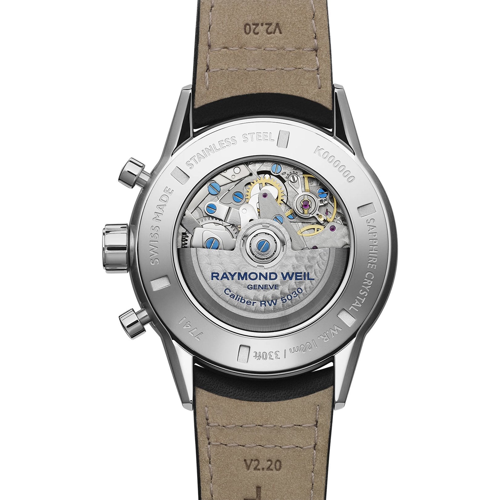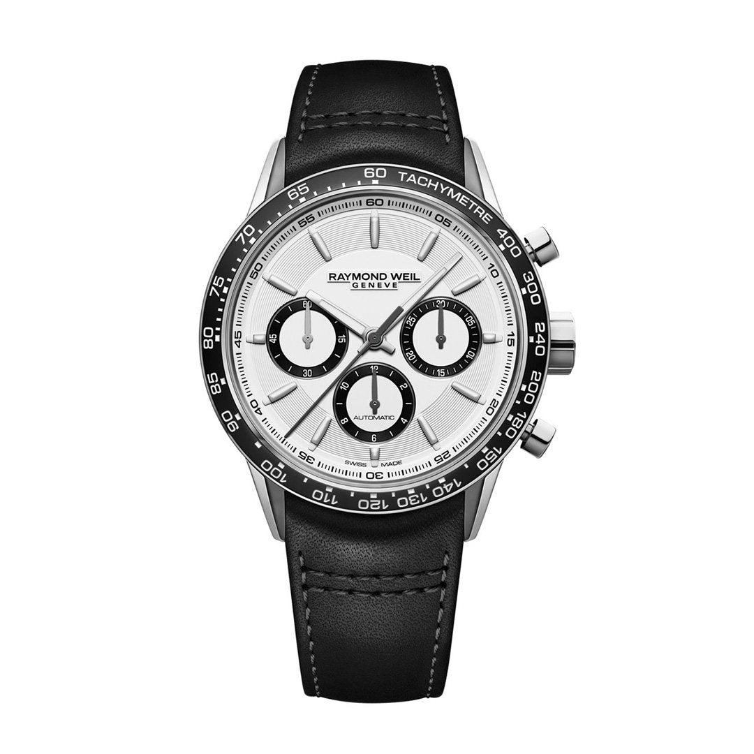 The Raymond Weil Freelancer 43.5mm Automatic Chronograph showcases a sleek black dial with a matching black ceramic bezel, housed in a robust stainless steel case. Paired with a sophisticated black leather strap.
