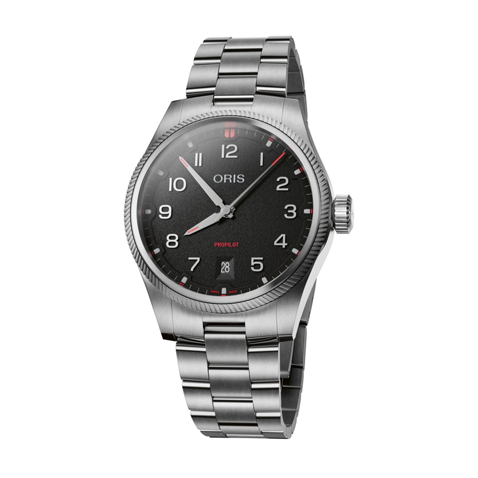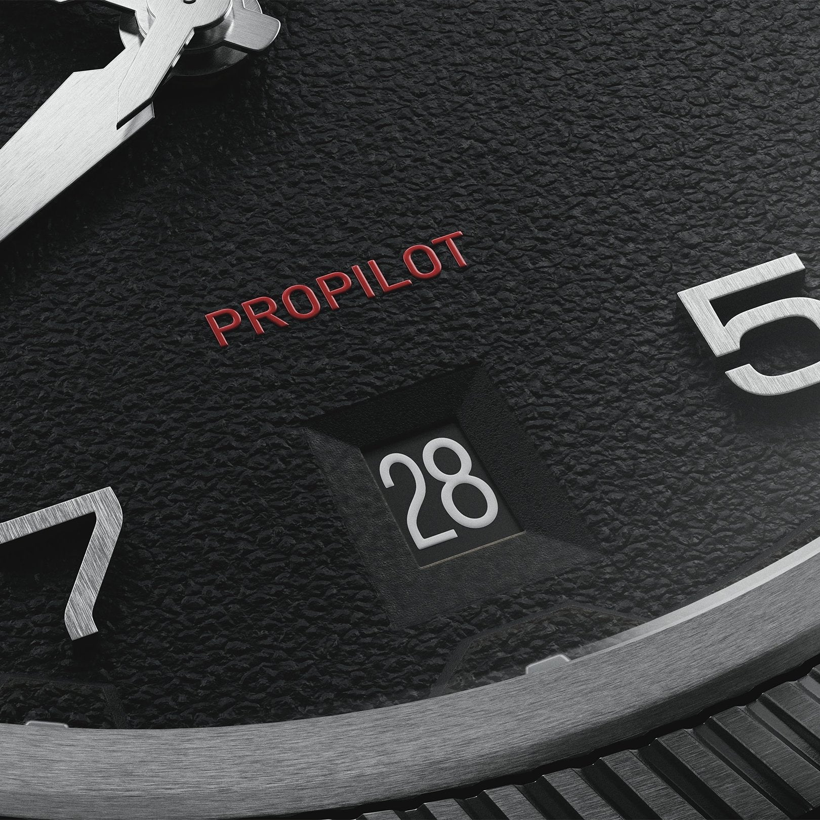 This Big Crown ProPilot watch features a 41mm stainless steel case with a black dial and applied metal numerals, finished on a stainless steel bracelet.
