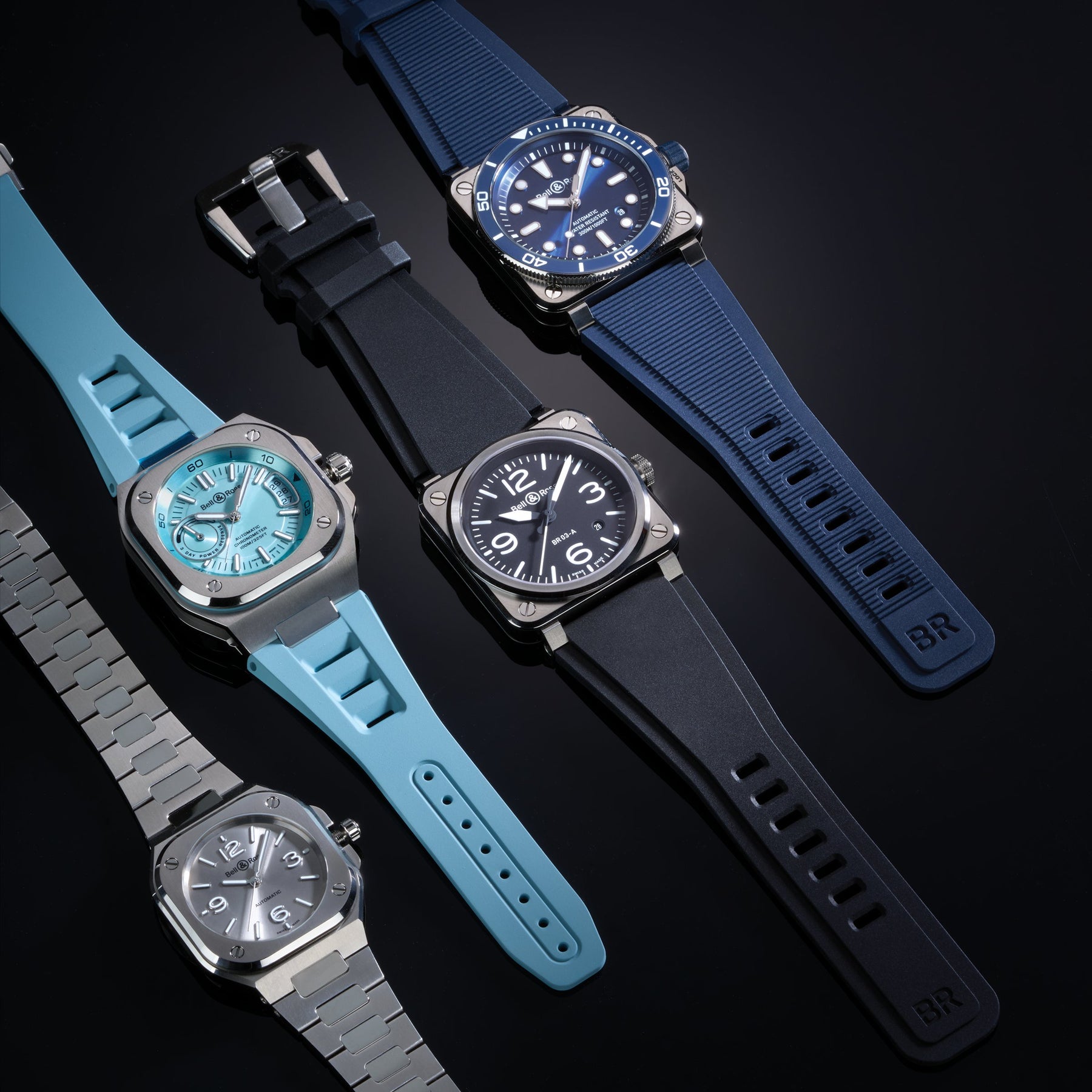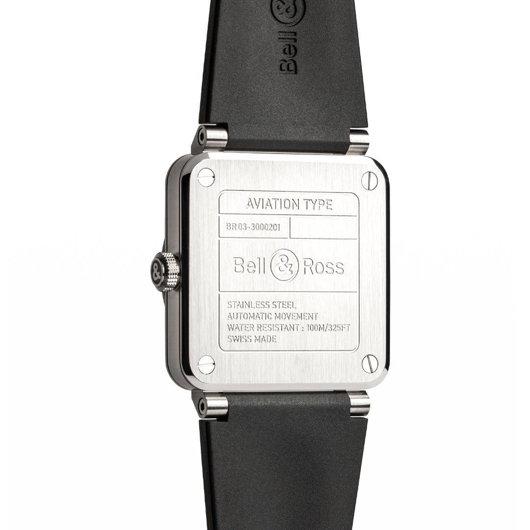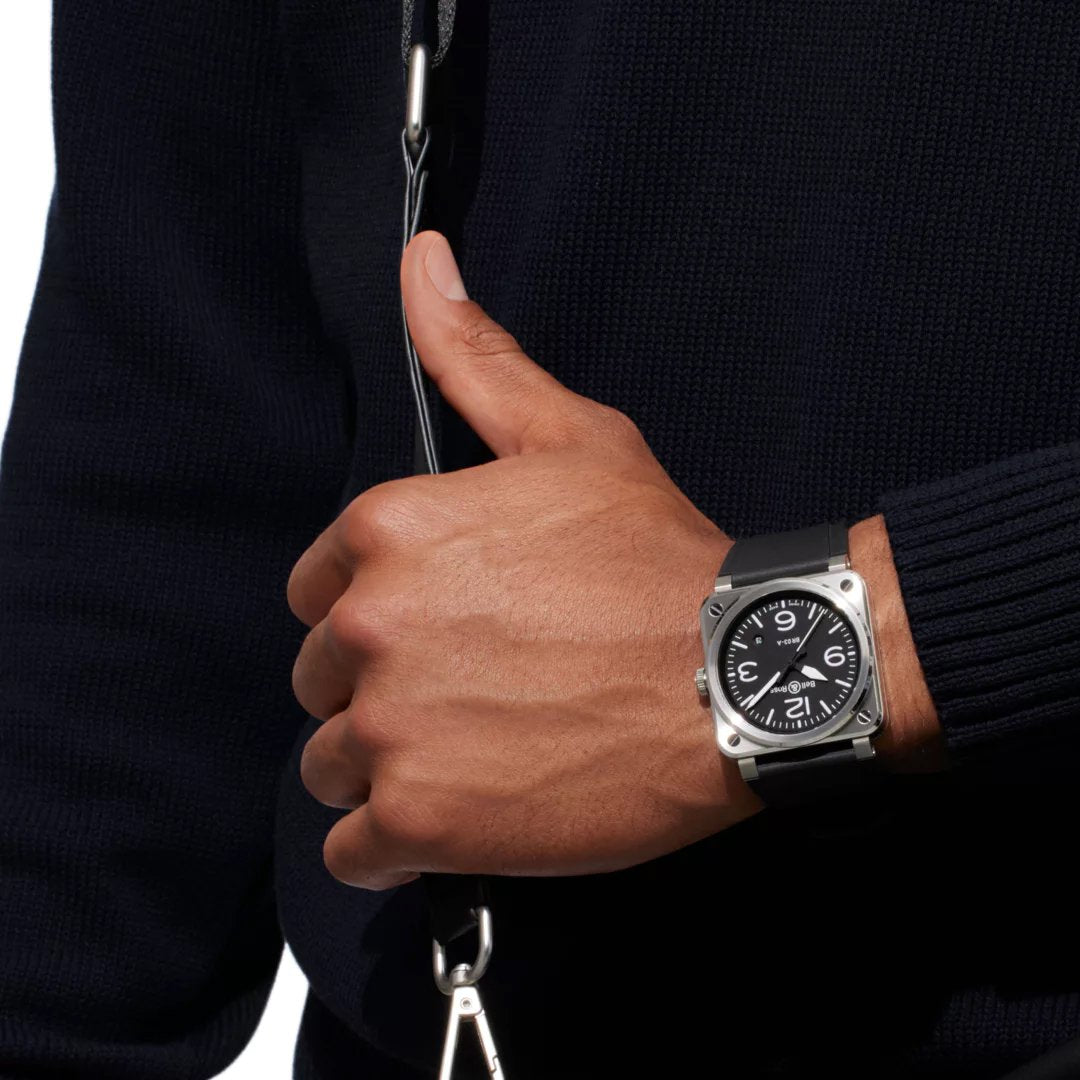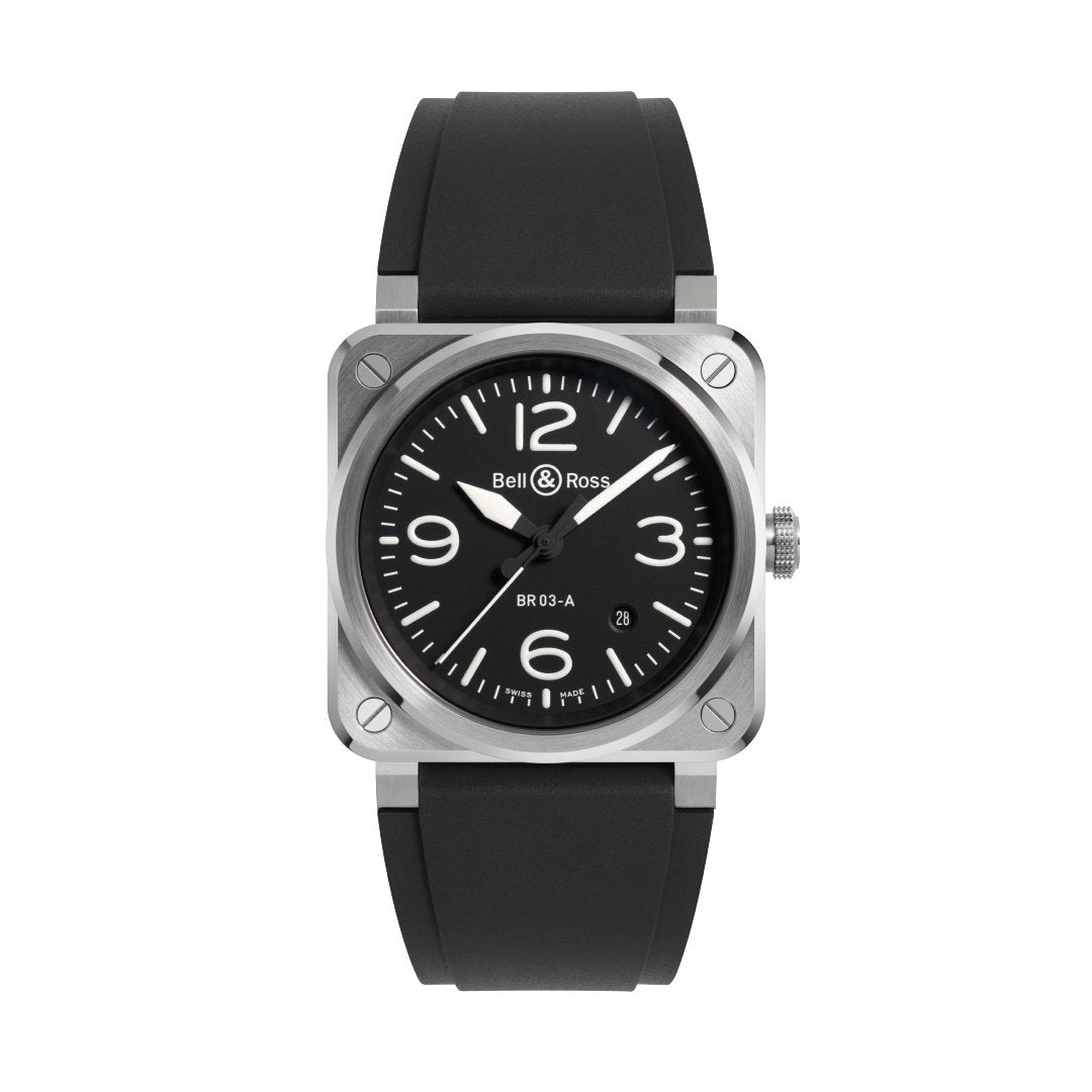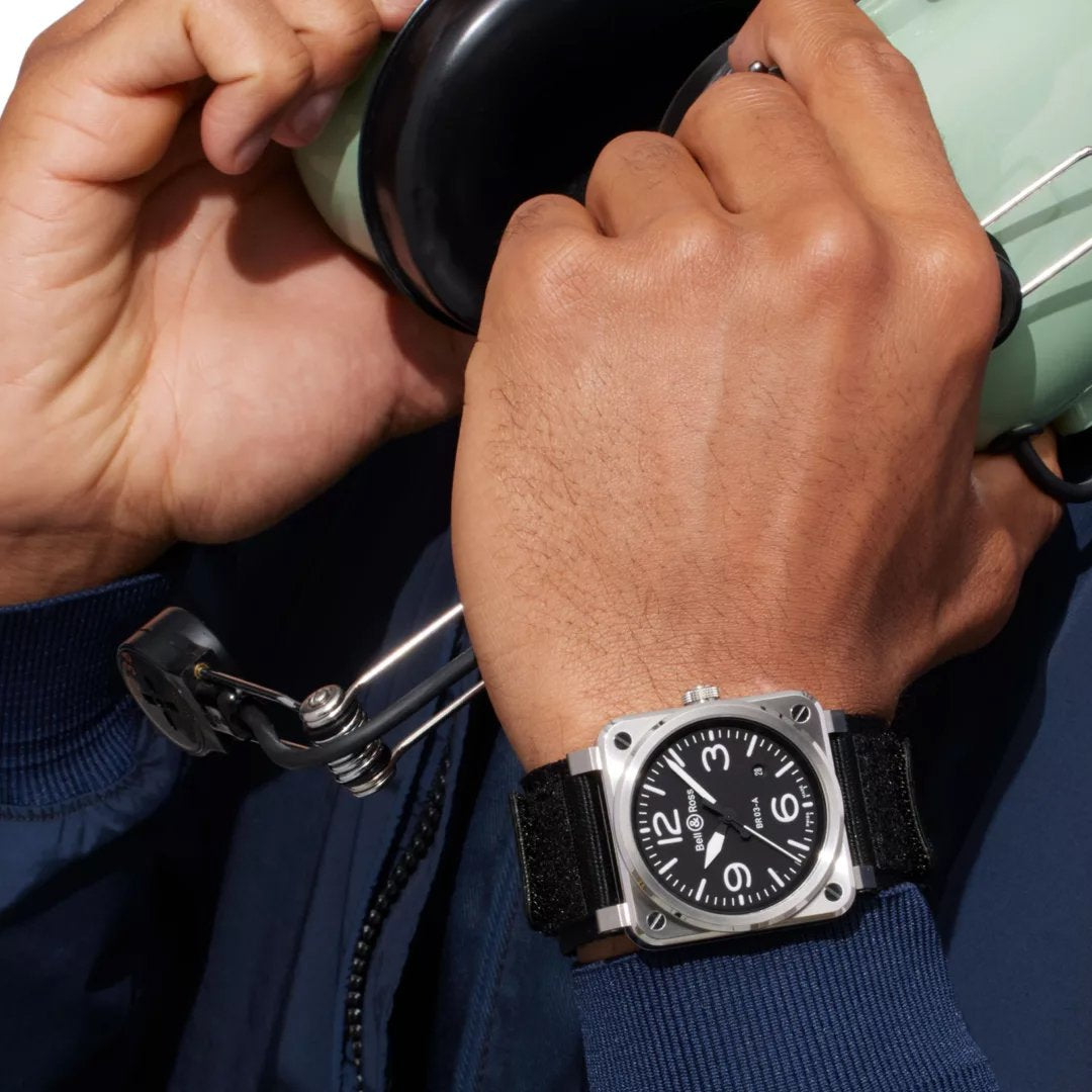 Automatic watch with Calibre BR-CAL.302-1, 54-hour power reserve, and date display. Features a 41mm satin-polished steel case, black dial with white Super-LumiNova® numerals, indices, and hands, and sapphire crystal. Water-resistant to 100 meters. Comes with a black rubber and synthetic fabric strap with a satin-polished steel pin buckle.