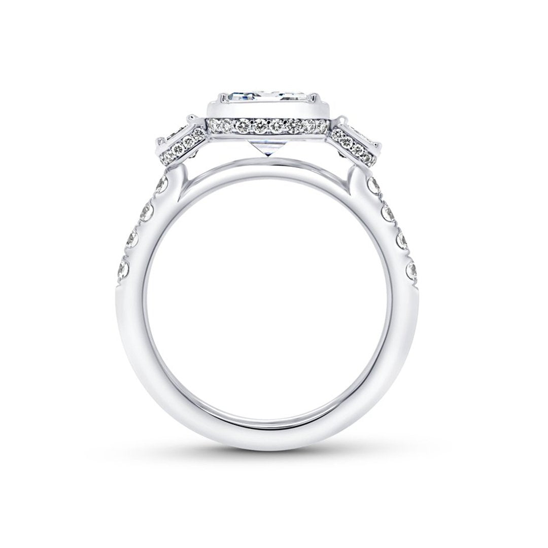 18K white gold hidden halo semi-mount ring with a four-prong setting for a 2.50 carat emerald-cut center. Accented with 54 round diamonds totaling 0.45 carats and 2 emerald-cut diamonds totaling 0.70 carats, all four-prong set. Diamonds are FG color and VS clarity.