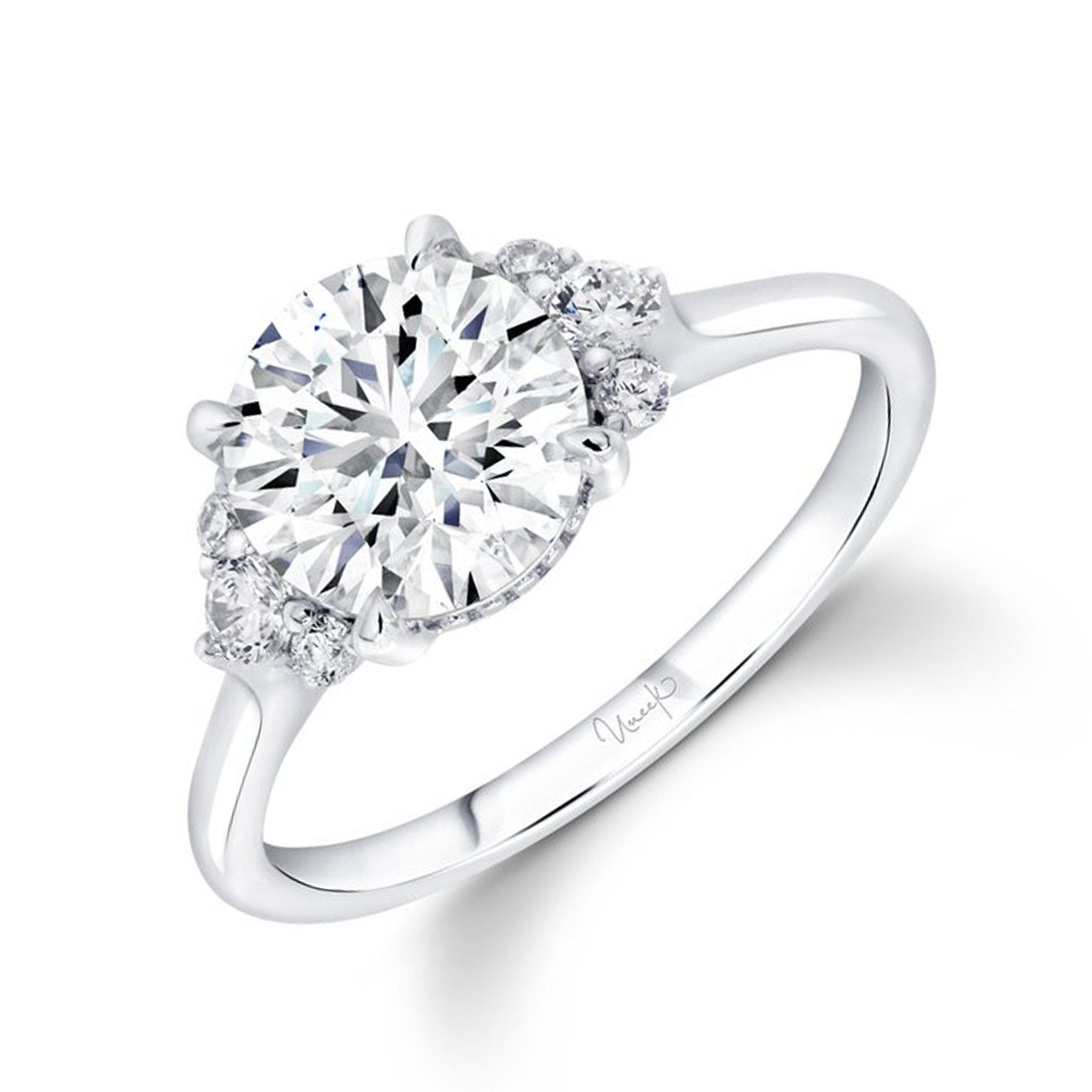 18K white gold semi-mount ring with a four-prong setting for a 2.00 carat round center. Accented with 6 round diamonds totaling 0.17 carats, prong set, FG color and VS clarity. Center sold separately. Available by special order in other metals, shapes, and sizes.