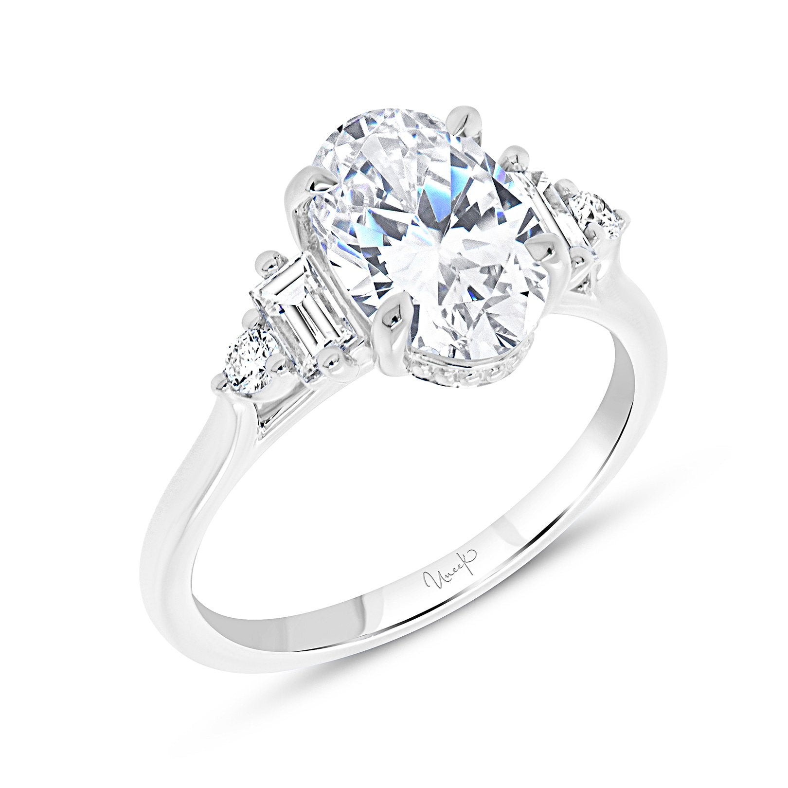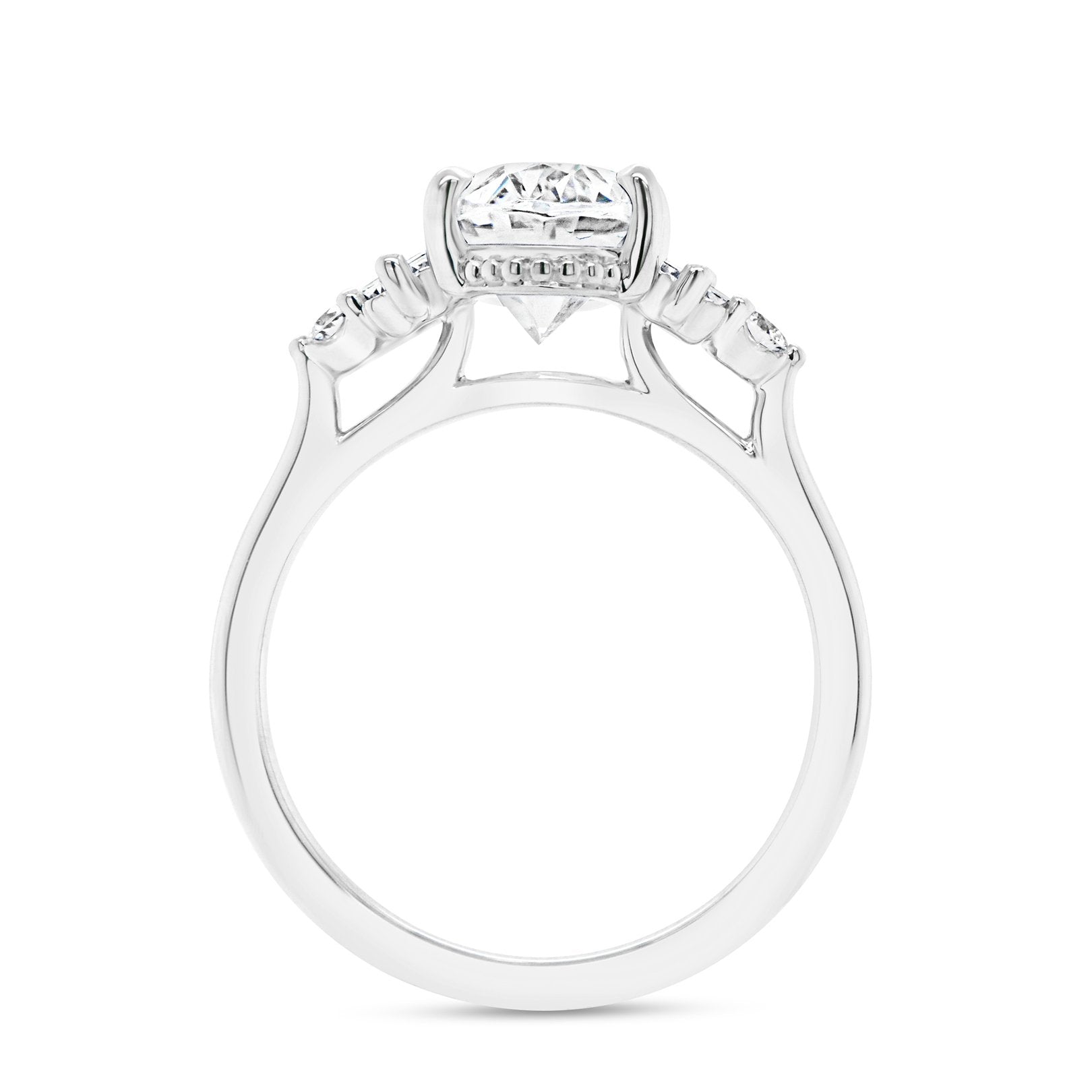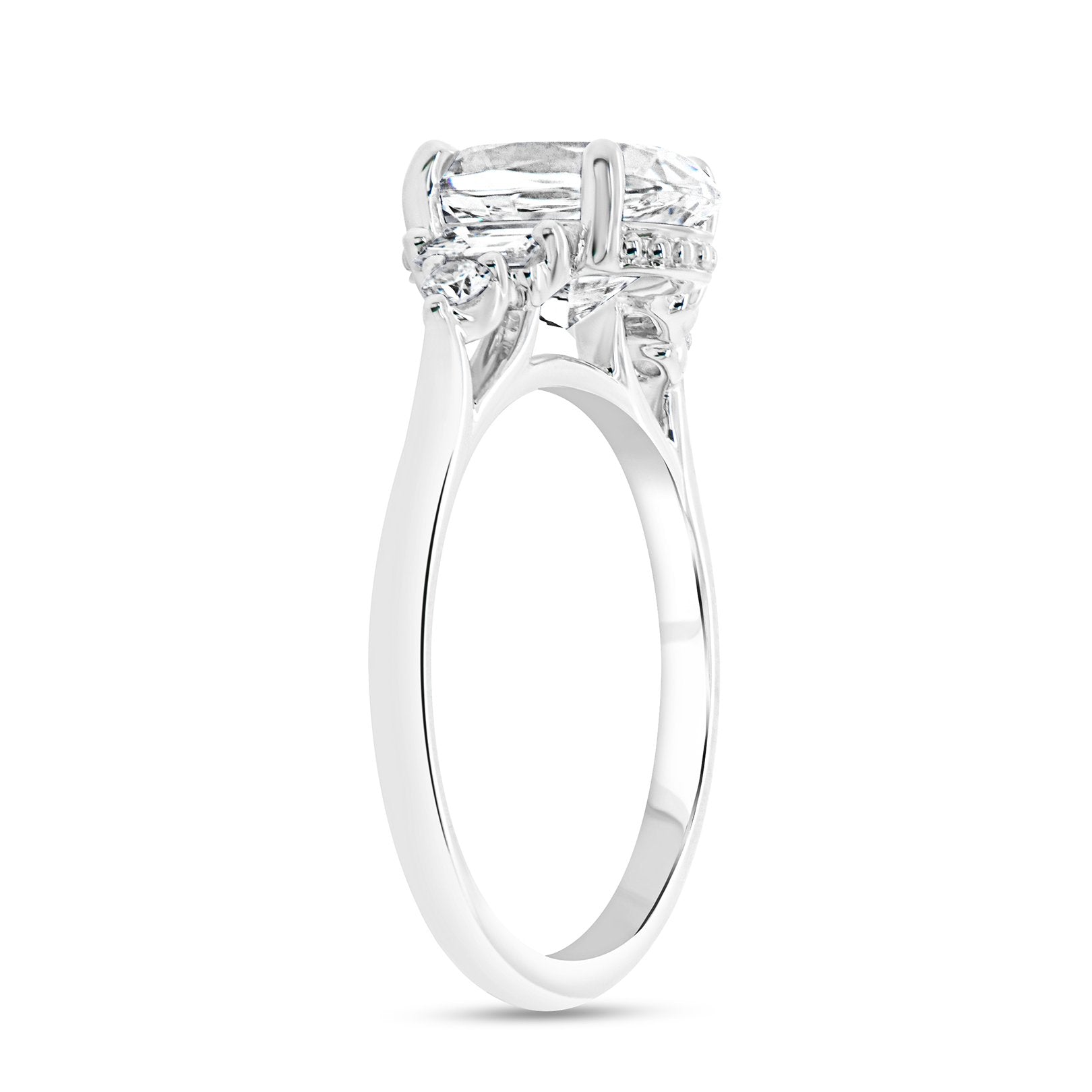 18K white gold semi-mount ring with a four-prong setting for a 3.00 carat oval center. Accented with 2 round diamonds totaling 0.09 carats in three-prong settings and 2 straight baguette diamonds totaling 0.28 carats in two-prong settings. Diamonds are FG color and VS clarity.