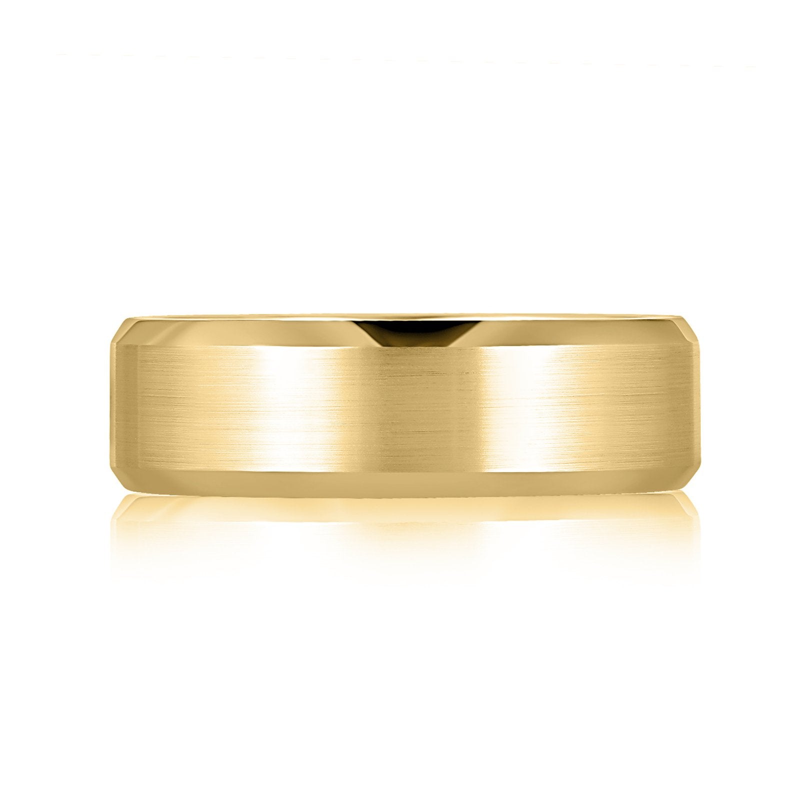 14kt yellow gold expandable 6mm band with satin finish and high-polish beveled edges, fits sizes 8.00–9.50.