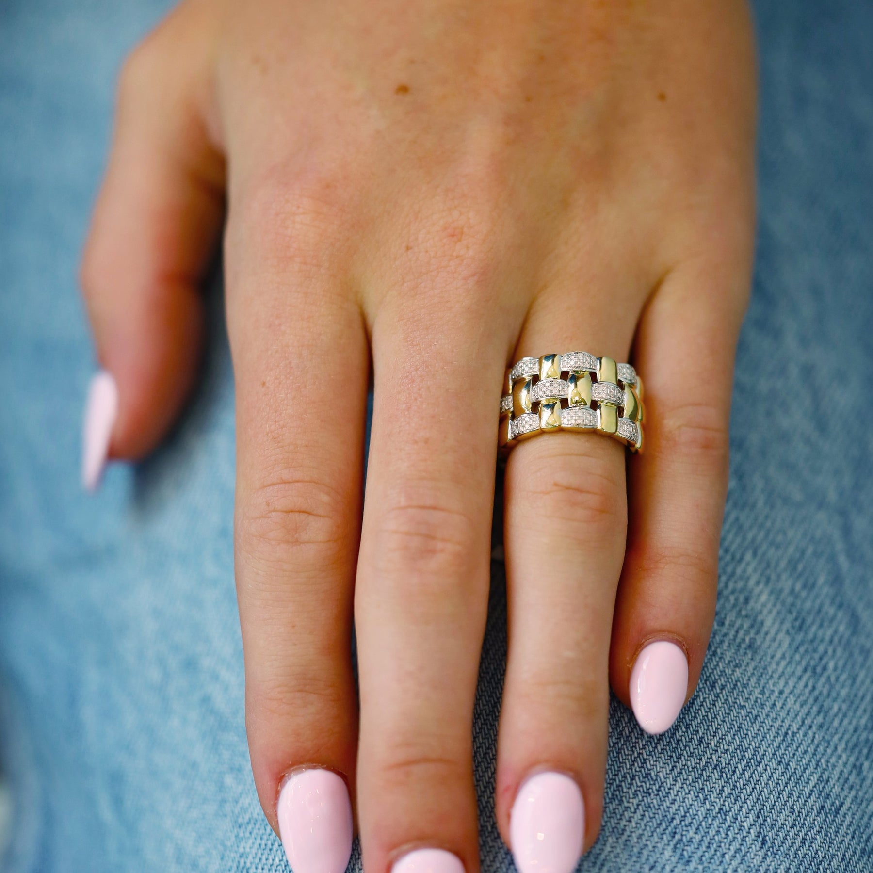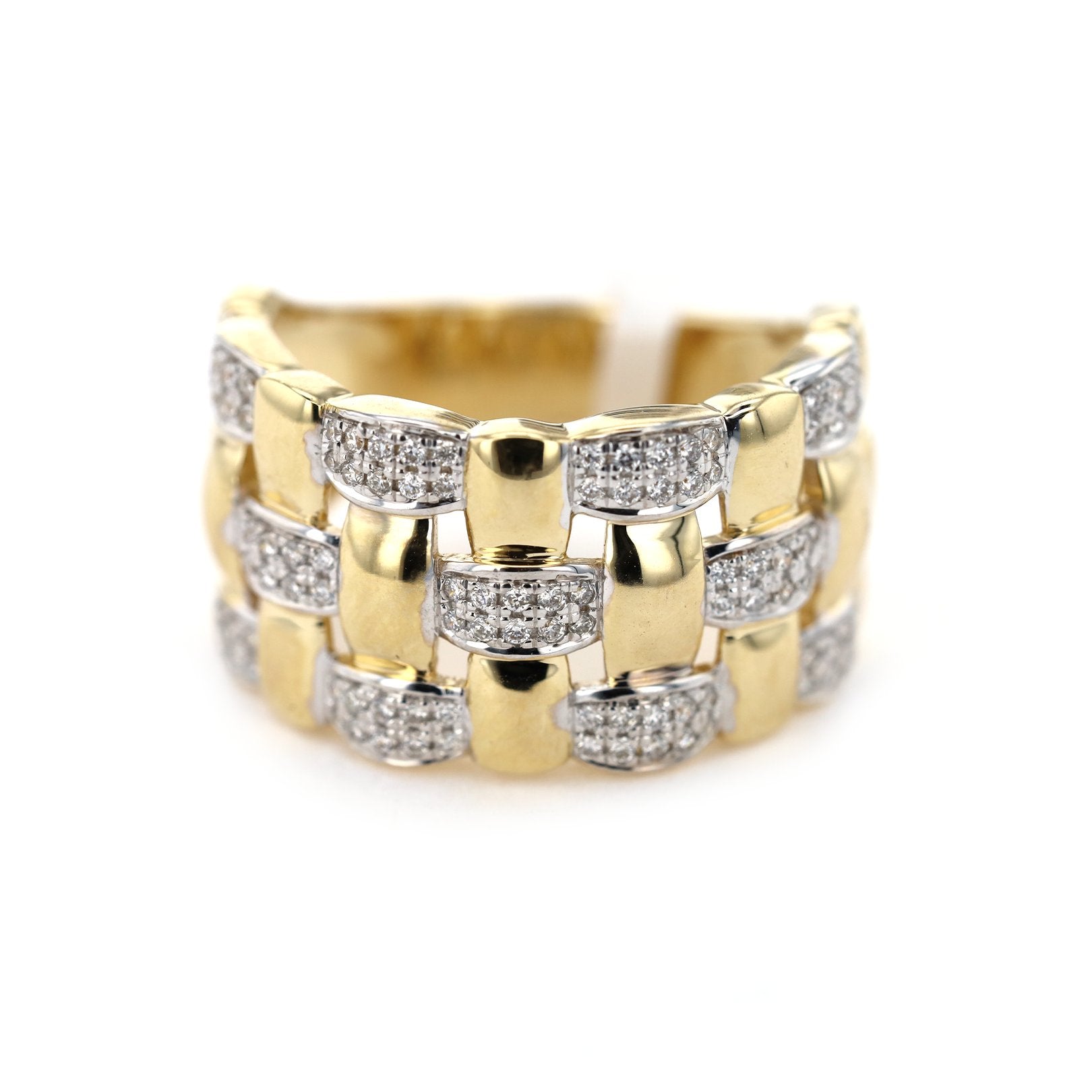 14K yellow gold wide band set with 110 prong-set round diamonds totaling approximately 0.30 ctw, HI color, SI clarity.
