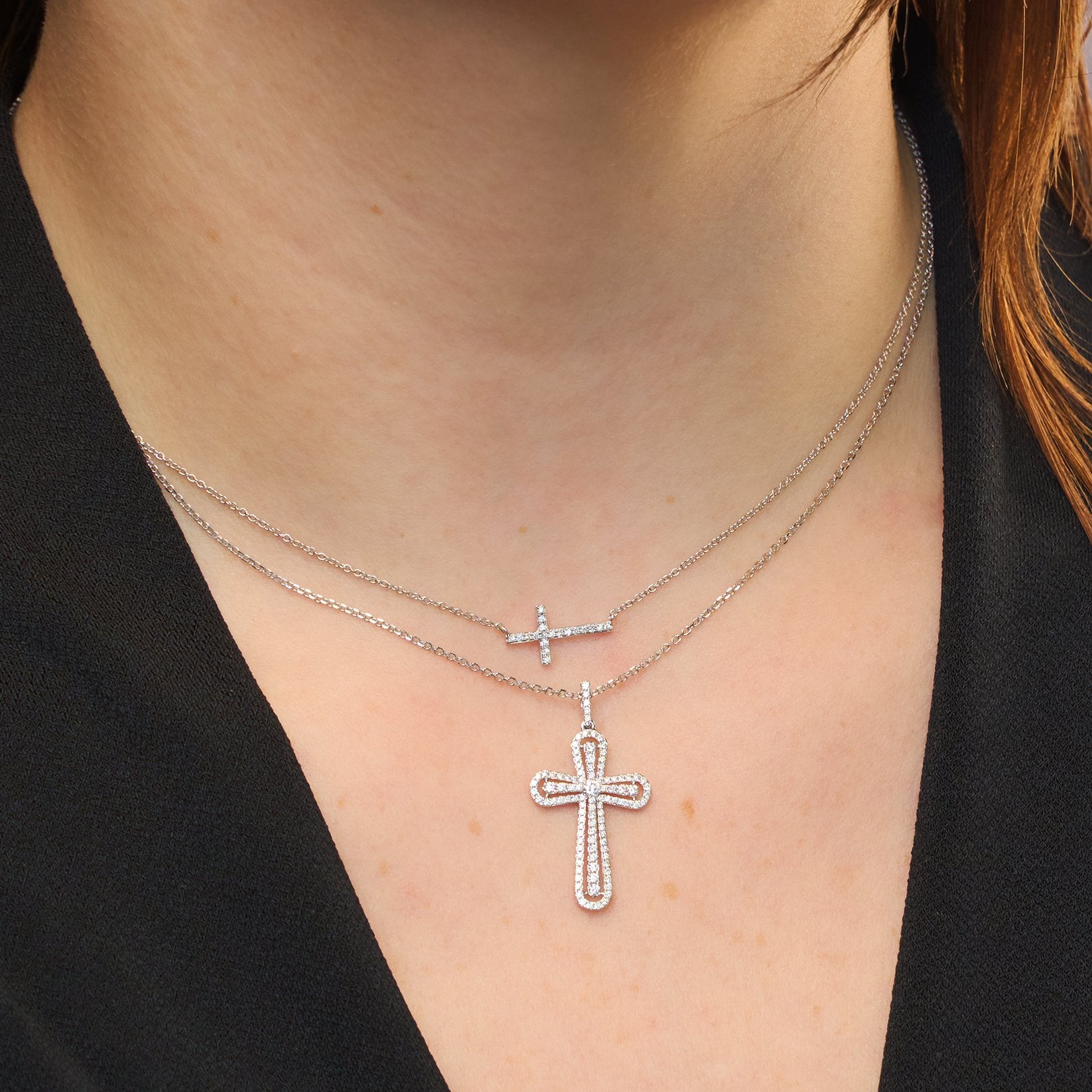 14kt white gold 16"+2" horizontal cross necklace with 19 prong-set round diamonds totaling 0.06ctw.
