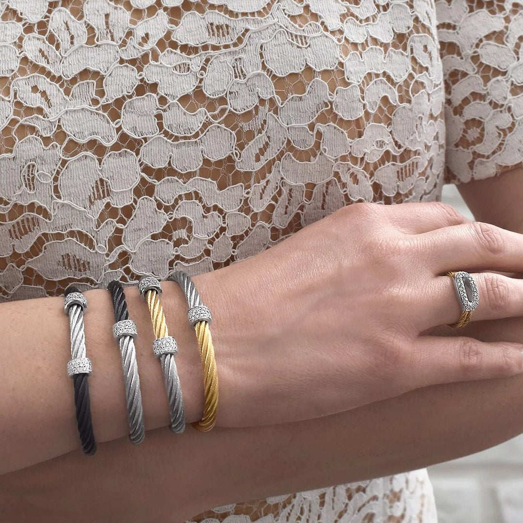 Modern and sophisticated, this ALOR bangle features black and grey stainless steel cable with 18KT white gold accents. A bold barrel station set with 0.13ctw prong-set round diamonds (GH/VS) adds brilliance to the contemporary design. Sized at 6.25".