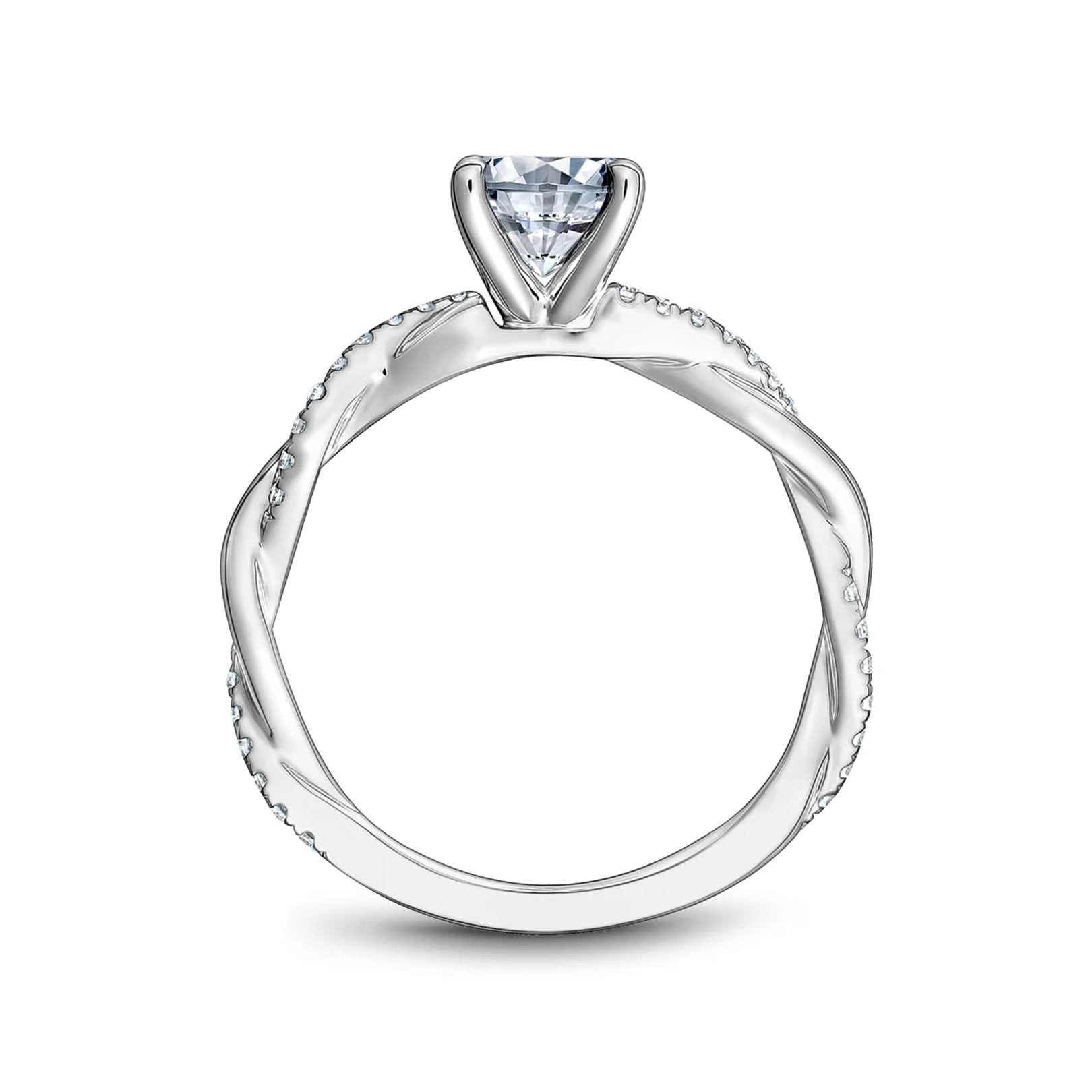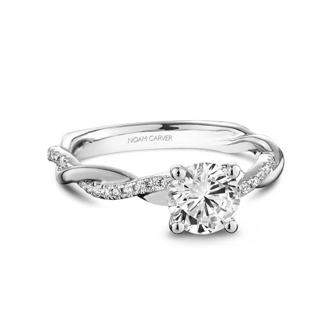Semi-mount ring with a 4-prong setting for a 2.00ct round crown size center. The 3/4 twisted shank is accented with 34 prong-set round diamonds totaling 0.18ctw.