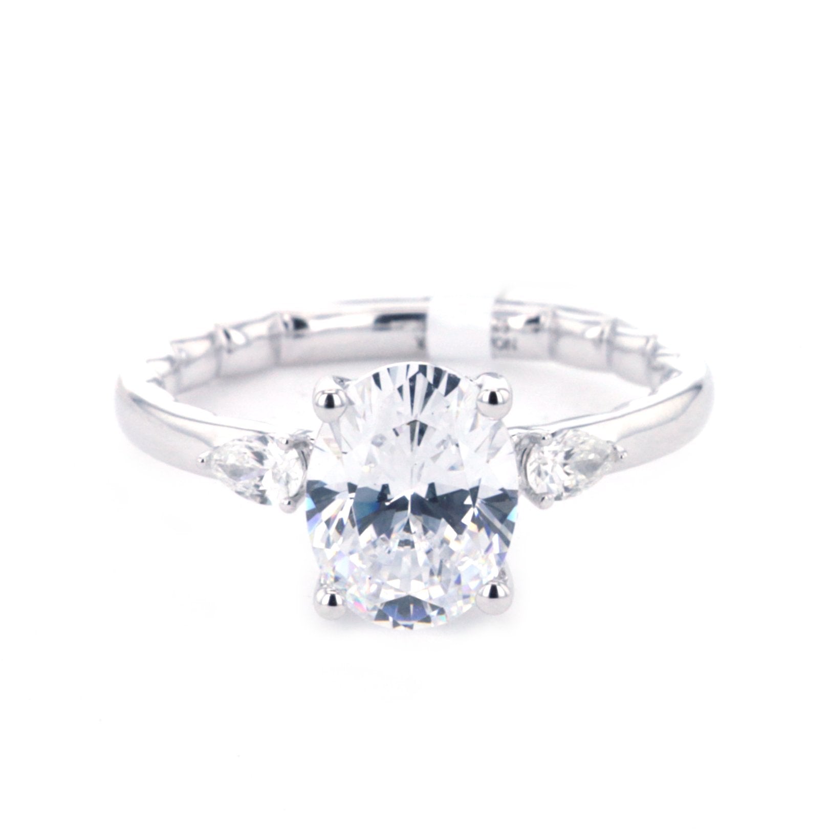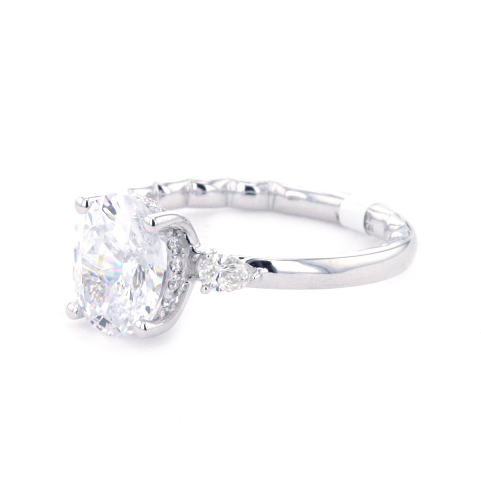 14kt white gold Noam Carver Luna semi-mount ring, 2mm wide, designed for a 2.00ct oval center in a 4-prong diamond gallery setting. Accented with 2 pear-shaped diamonds (0.14ctw) in 3-prong settings and 14 round diamonds (0.08ctw, GH/SI) in prong settings.
