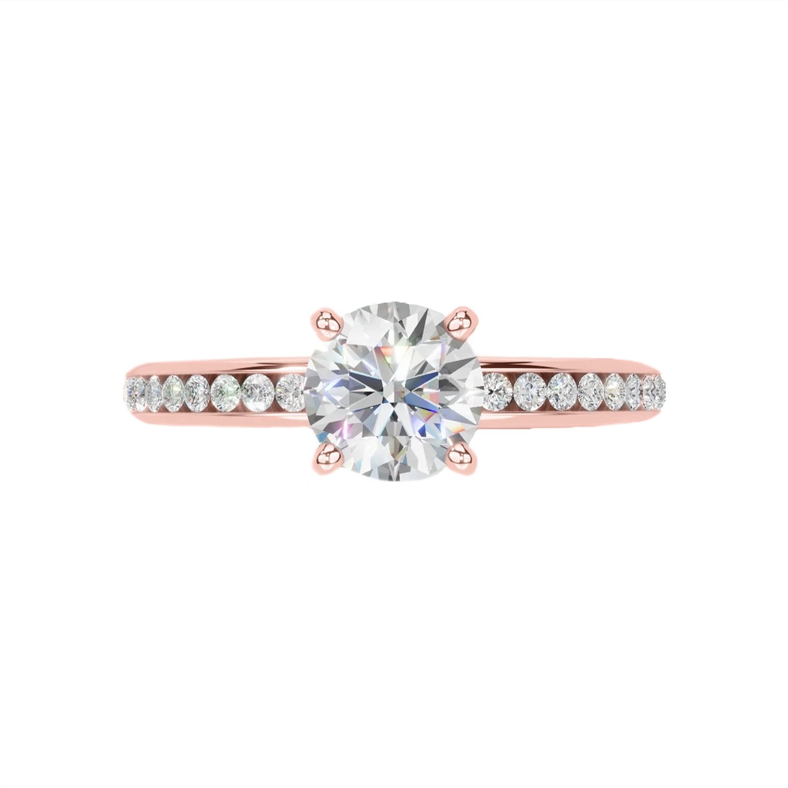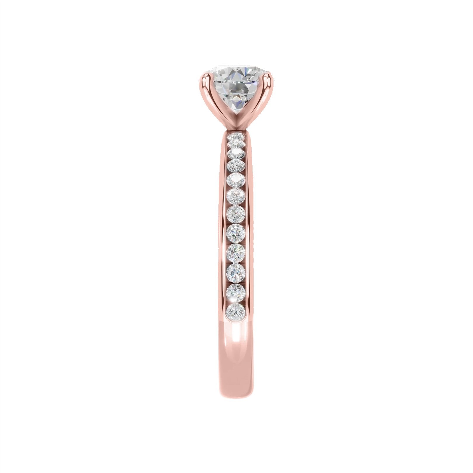14K rose gold semi-mount ring with a 4-prong white gold head (fits approx. 1.00ct round center, sold separately) and 24 channel-set round diamonds totaling 0.26 carats (FG/VS). From the Signature Collection by Continental Diamond. Available by special order in other metals, diamond shapes, and sizes.