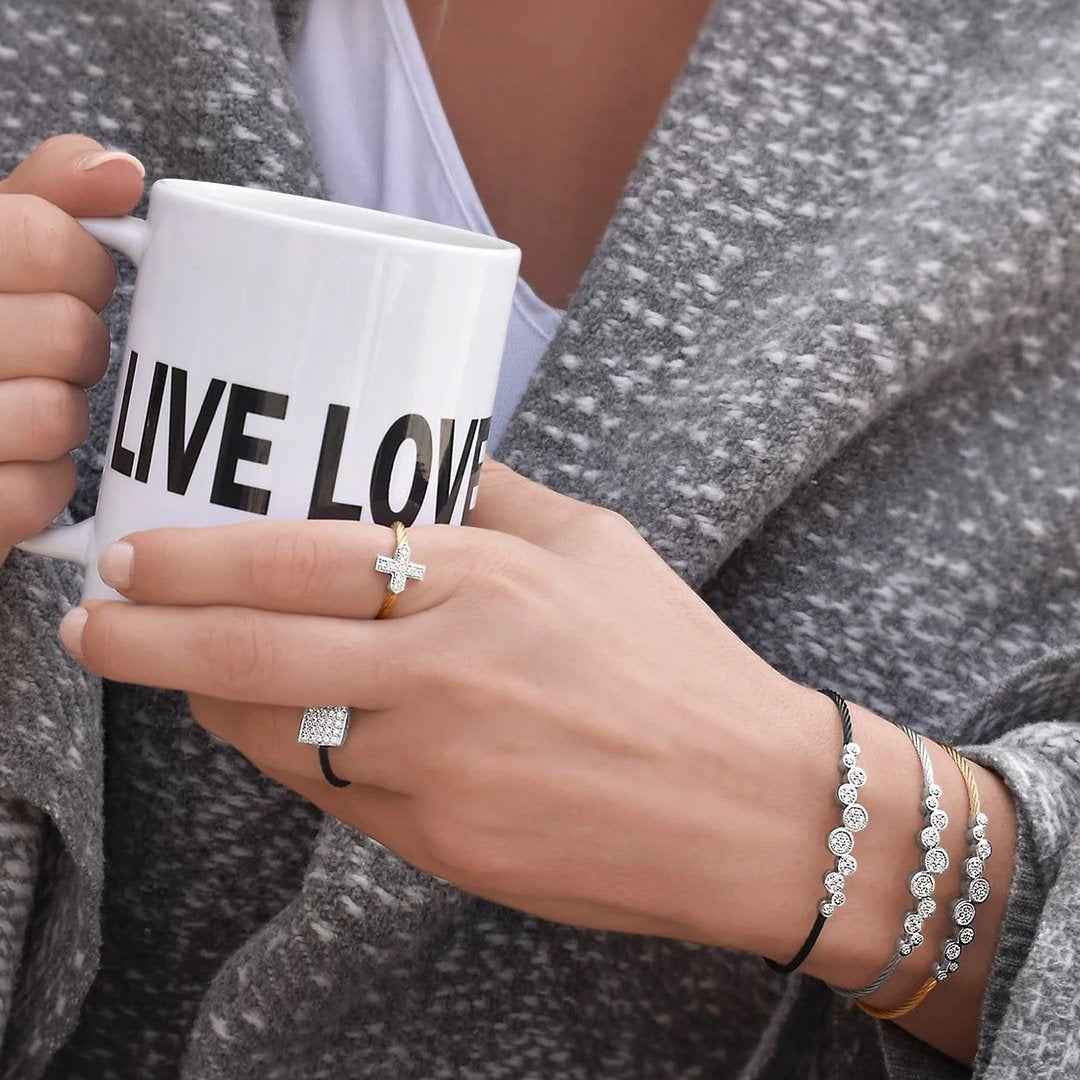 18K white gold and stainless steel black cable bangle with 10 graduating round stations featuring 0.28ctw pavé-set round diamonds, GH color, VS clarity. Size 6.5.