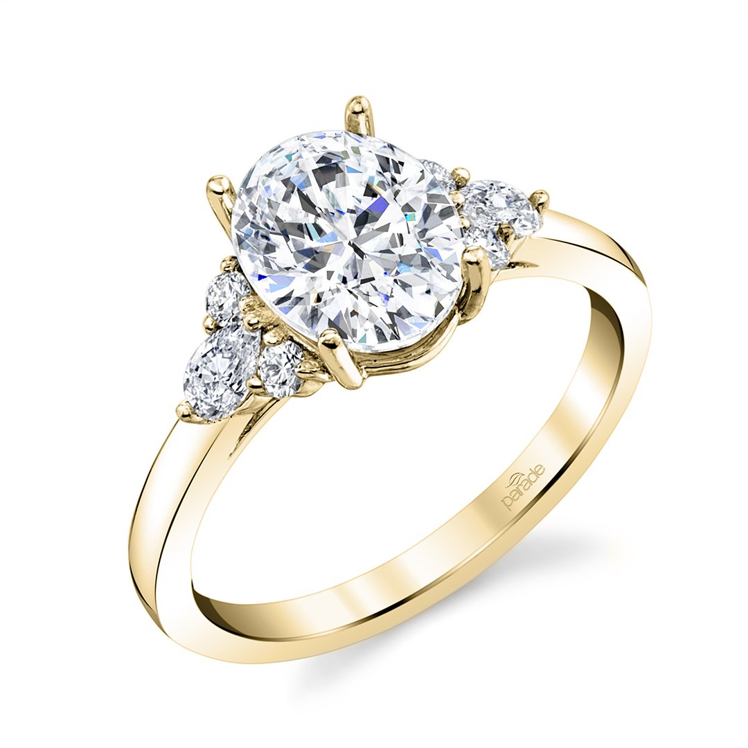14K yellow gold 4-prong cathedral semi-mount ring (2.00 ct oval crown size) featuring 4 three-prong-set round diamonds totaling 0.10 ctw and 2 two-prong-set pear diamonds totaling 0.16 ctw (GH/VS-SI1). Center sold separately. Available by special order in other metals, shapes, and sizes.