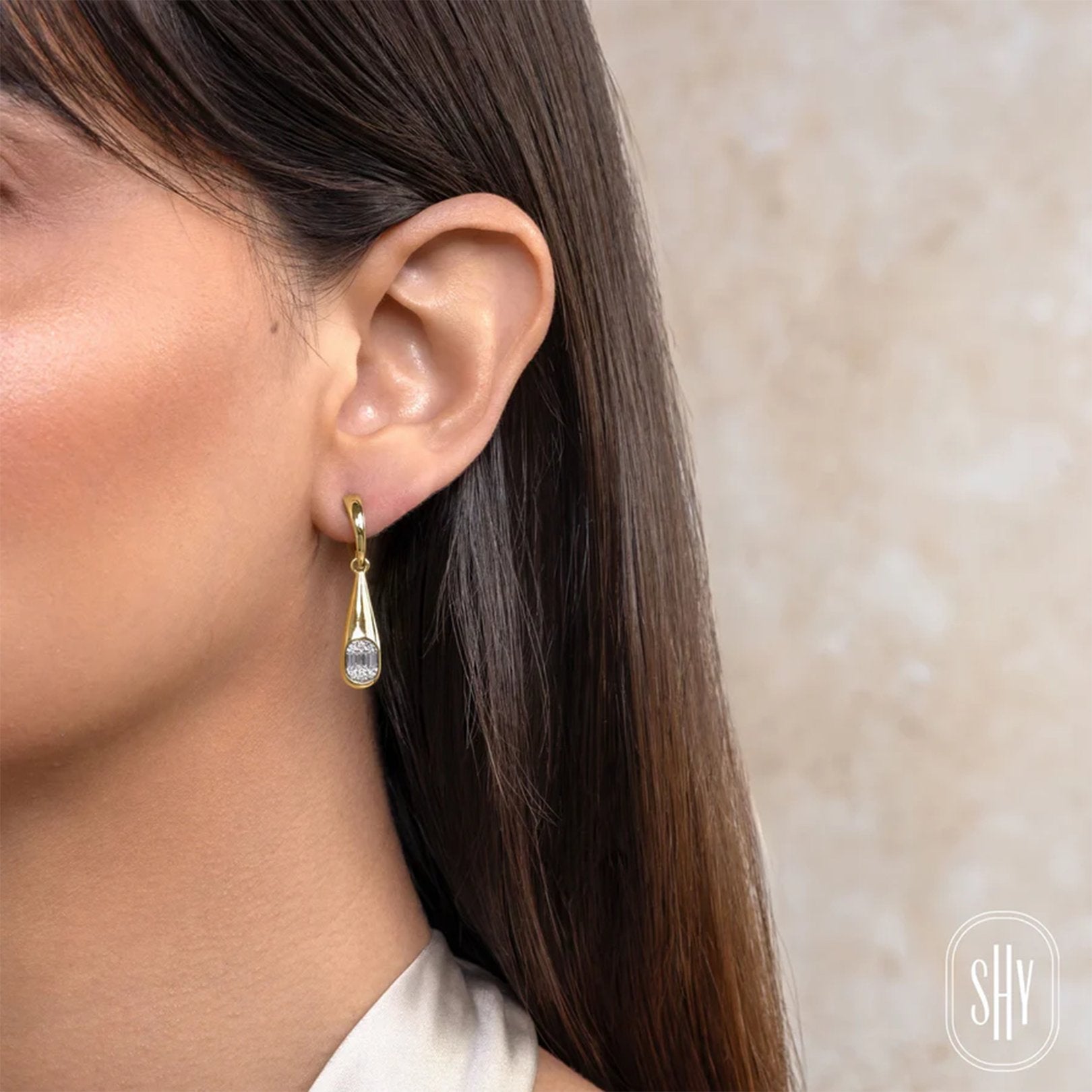 14kt yellow gold drop earrings with 18 round and baguette diamonds (0.40ctw, GH/SI) in channel and prong settings.