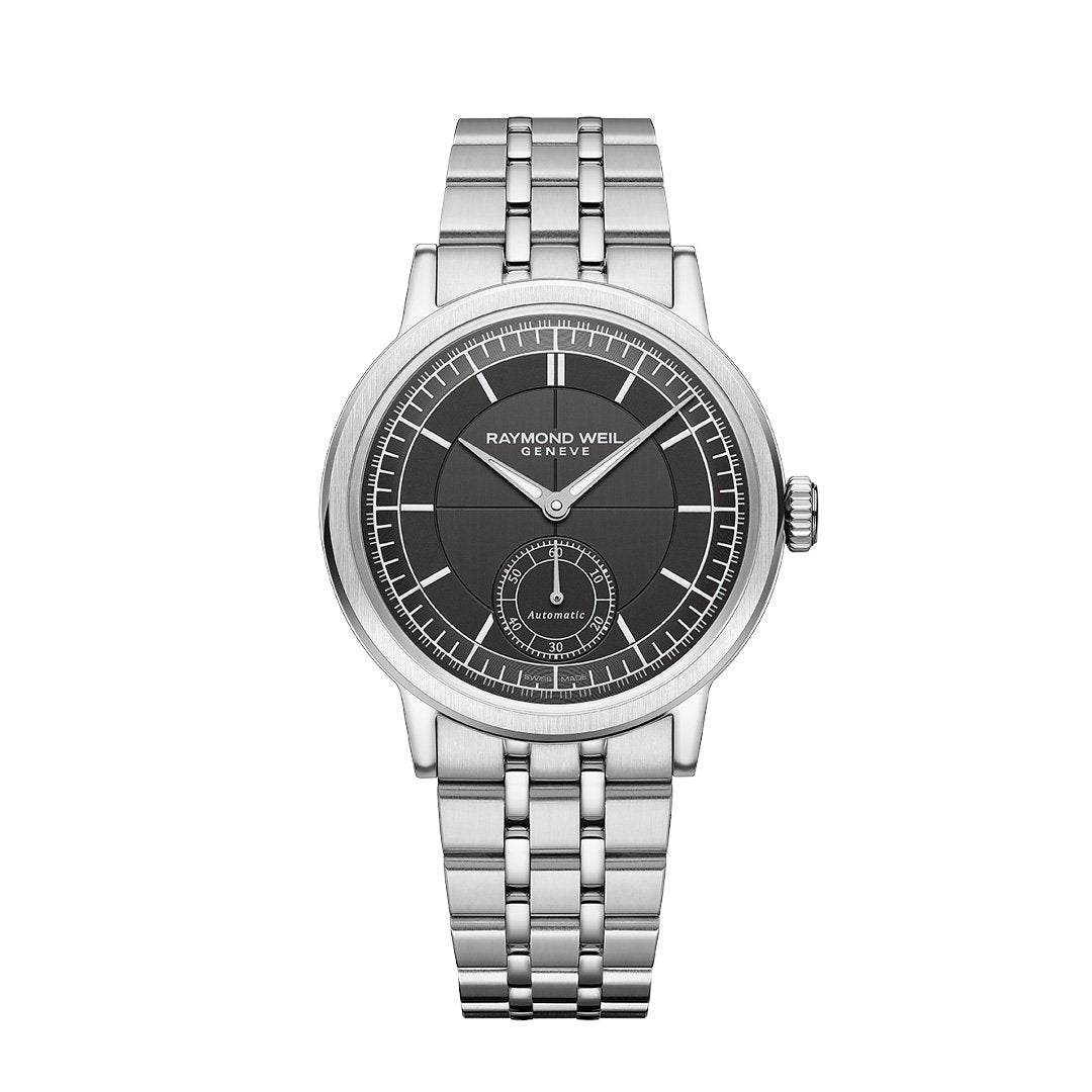 The Millesime 39.5mm Stainless Steel Automatic by Raymond Weil features a refined grey sector dial with small seconds subdial and sleek index markers. Housed in a polished stainless steel case and paired with a matching bracelet. Center sold separately. Available by special order in other metals, shapes, and sizes.