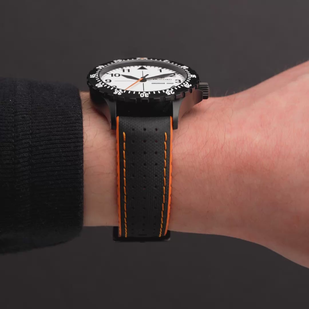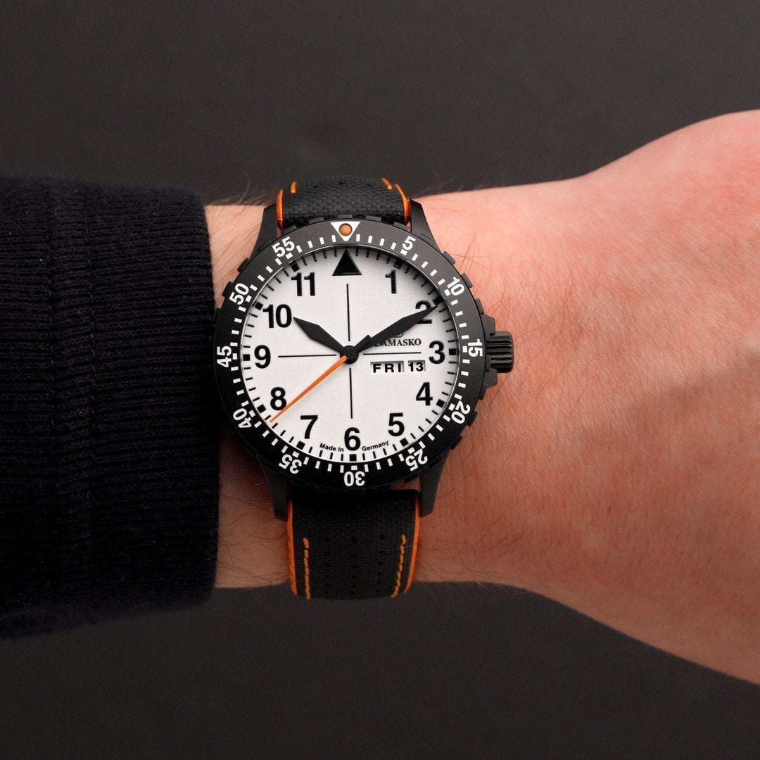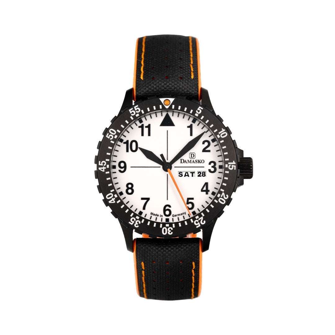 This pre-owned Damasko DA43 features a 40mm black case with a crisp white dial and a black ceramic bezel. Powered by an automatic movement, it offers robust reliability and precision, along with excellent resistance to wear. The watch is fitted with a black and orange rubber strap, adding a sporty, high-contrast look to this durable, German-engineered timepiece.