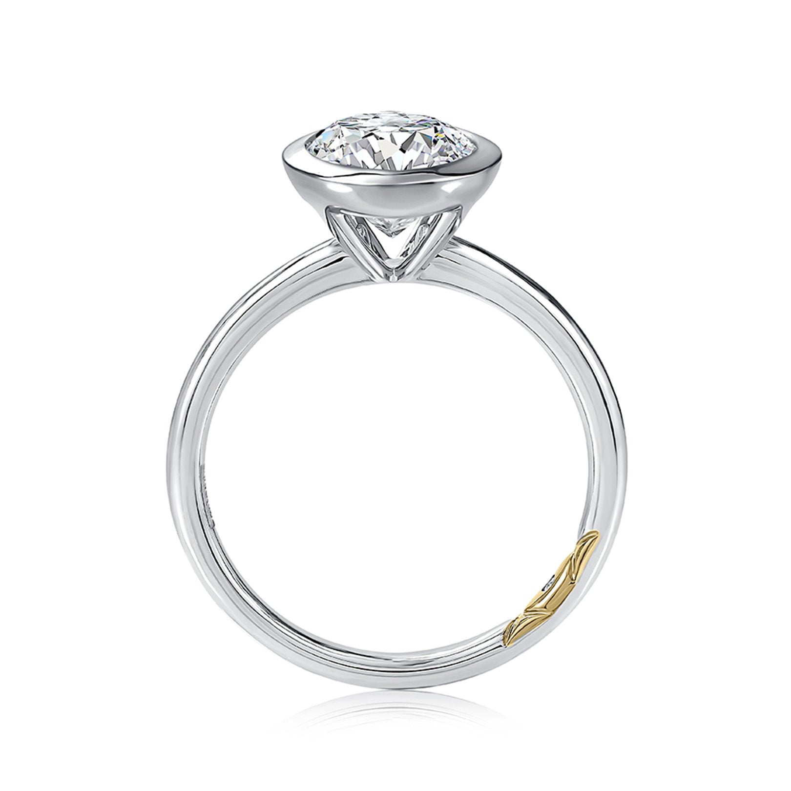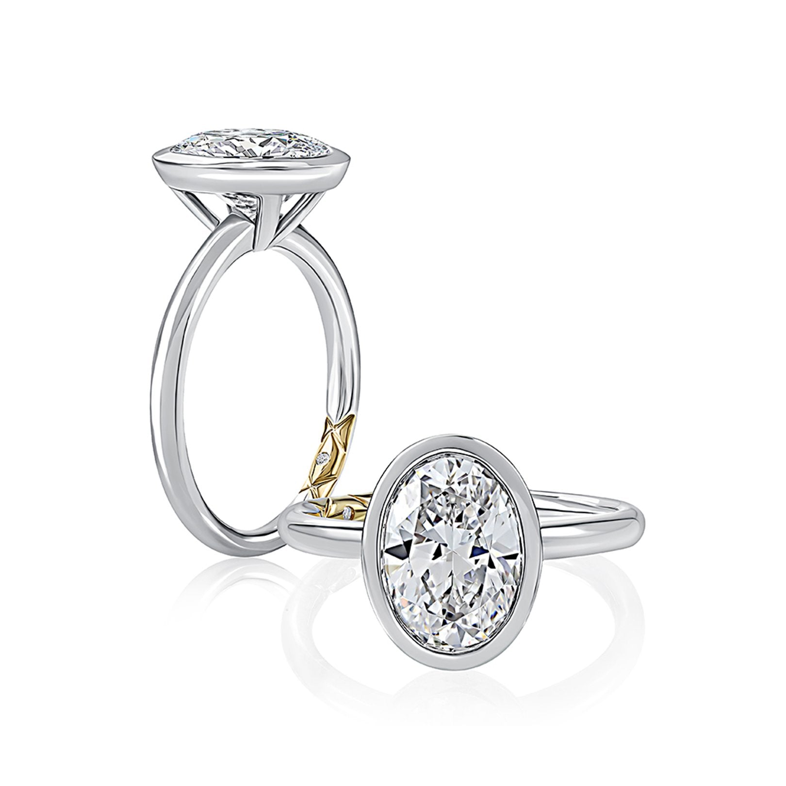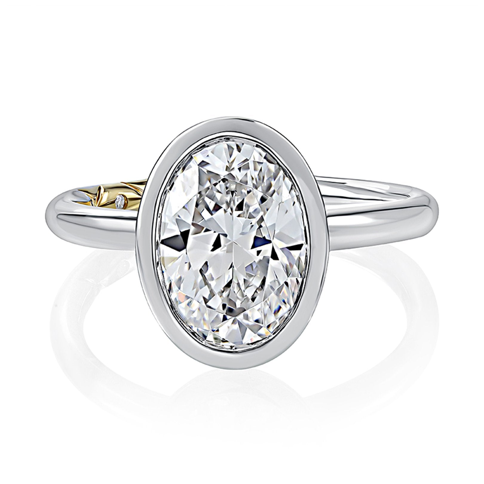 Bezel-set solitaire ring designed for a 2.50ct oval center, featuring a yellow quilt accent and a hidden diamond detail. Center sold separately. Available by special order in other metals, shapes, and sizes.