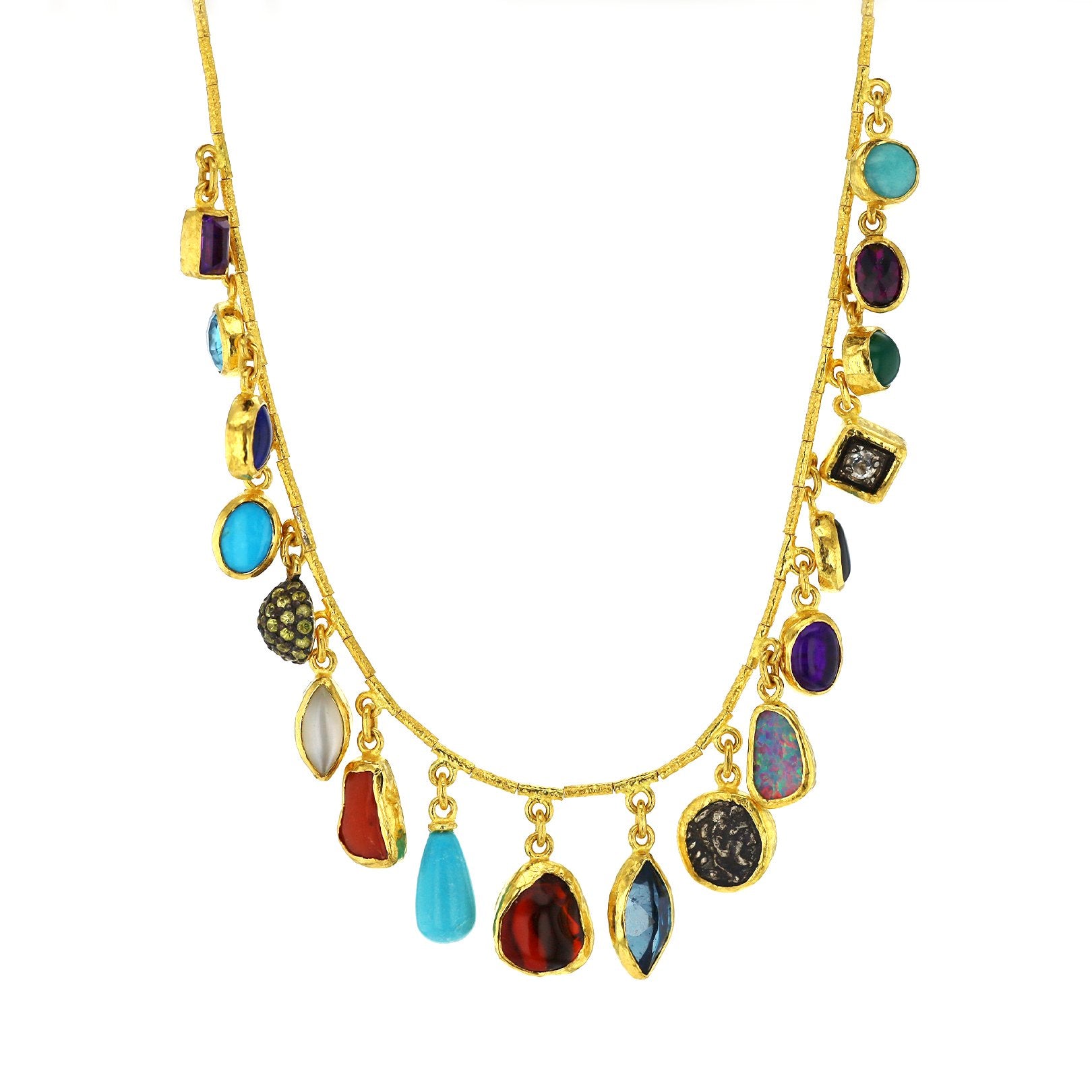 24K yellow gold 18" necklace featuring 18 gem and coin drops, 14 seed pearls, and gold barrel beads. Finished with a hook closure.