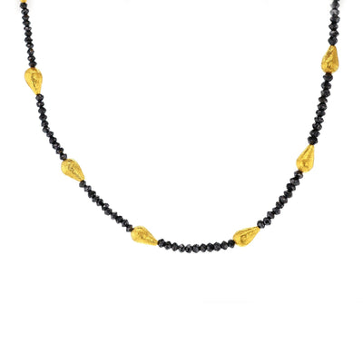 24kt yellow gold 18" necklace with 17 teardrop beads and 198 faceted black diamonds (9.68ctw), finished with a hook closure.